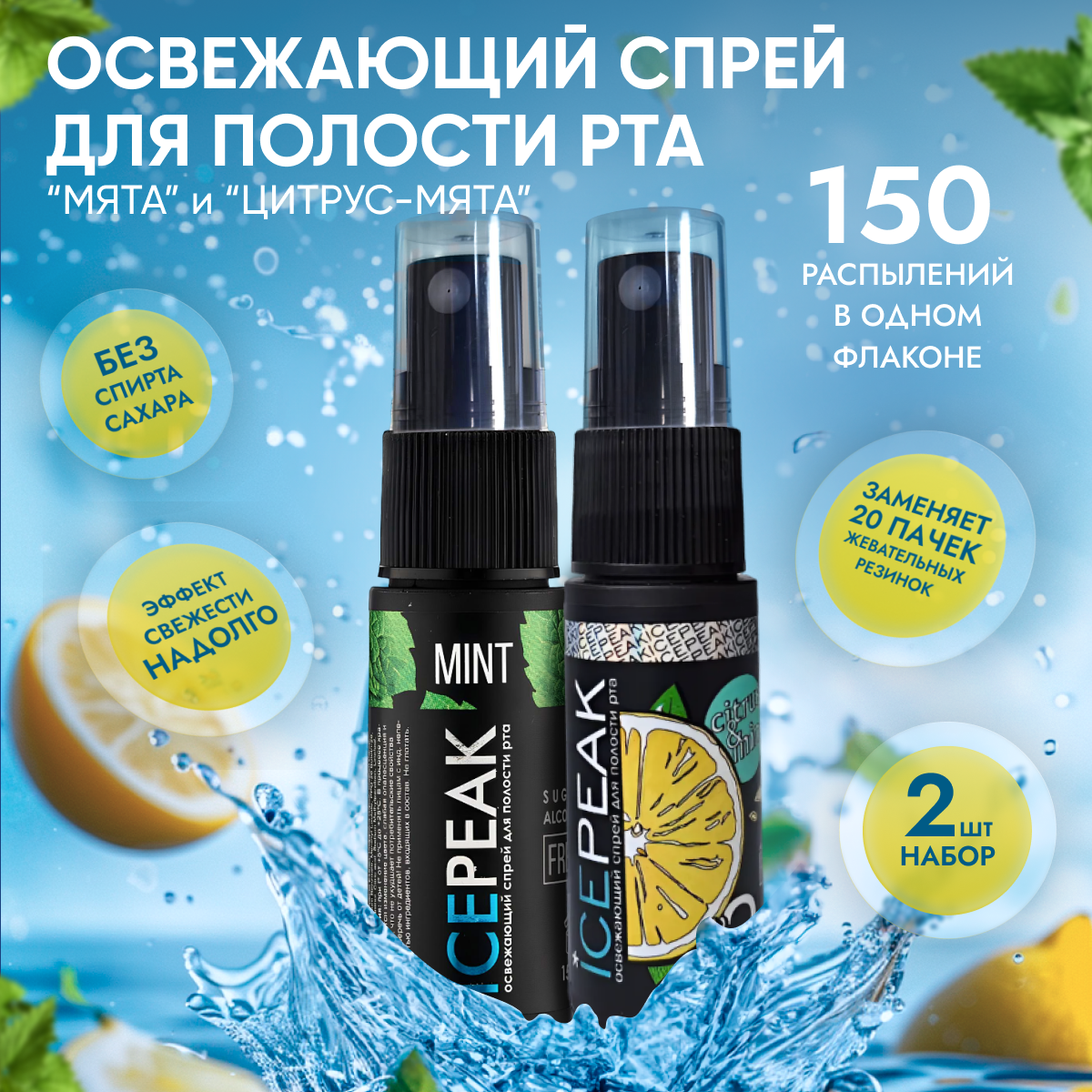 Спрей освежитель IcePeak для полости рта с мятой, 2 шт.