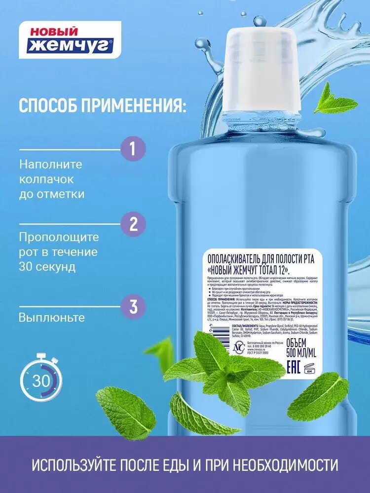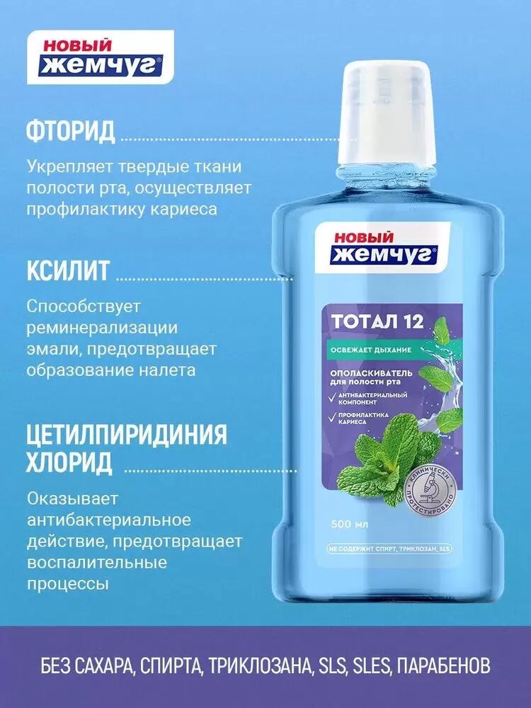 | Дополнительная информация | Ополаскиватель для полости рта Новый жемчуг Тотал 12, 500 мл. Ополаскиватель укрепляет десны, освежает дыхание, оказывает профилактику кариеса, препятствует образованию налёта. Осуществляет комплексный уход за полостью рта даже в тех случаях, когда использование зубной пасты невозможно. Предварительная чистка зубов пастой усиливает действие ополаскивателя. Комплекс натуральных экстрактов ромашки, календулы, зверобоя, крапивы, мяты, эхинацеи, шалфея предотвращает воспаление и снижает кровоточивость десен. Ополаскиватель безопасен при случайном проглатывании. Не сушит и не раздражает слизистую оболочку полости рта. |