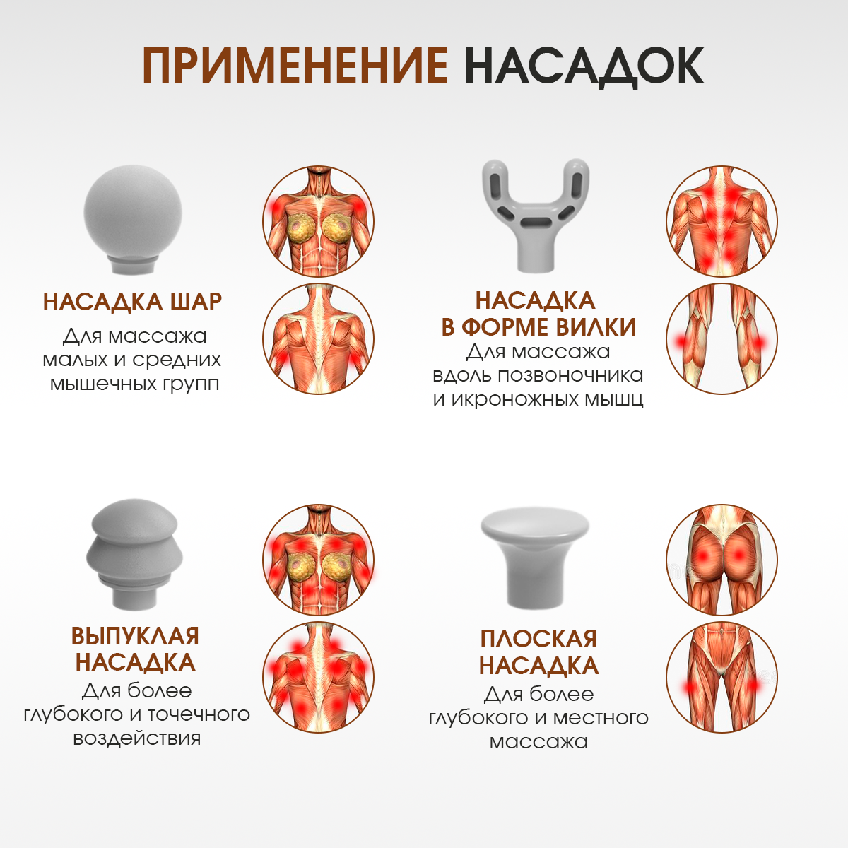 | Зона массажа | бедра / голени / живот / колени / ладони / лодыжки / локти / ноги / плечи / поясница / пресс / пятки / руки / спина / стопы / талия / тело / шея / ягодицы |
