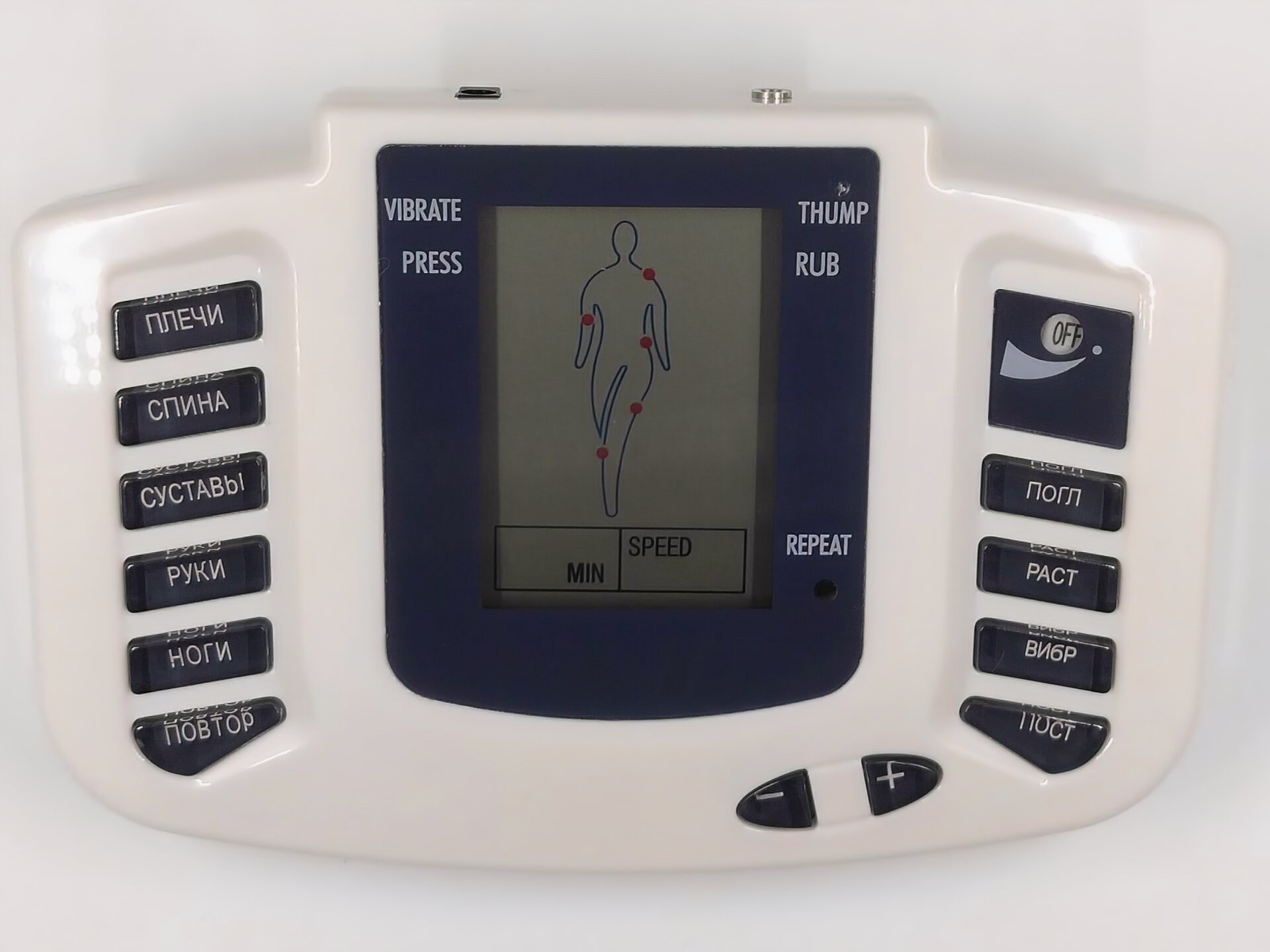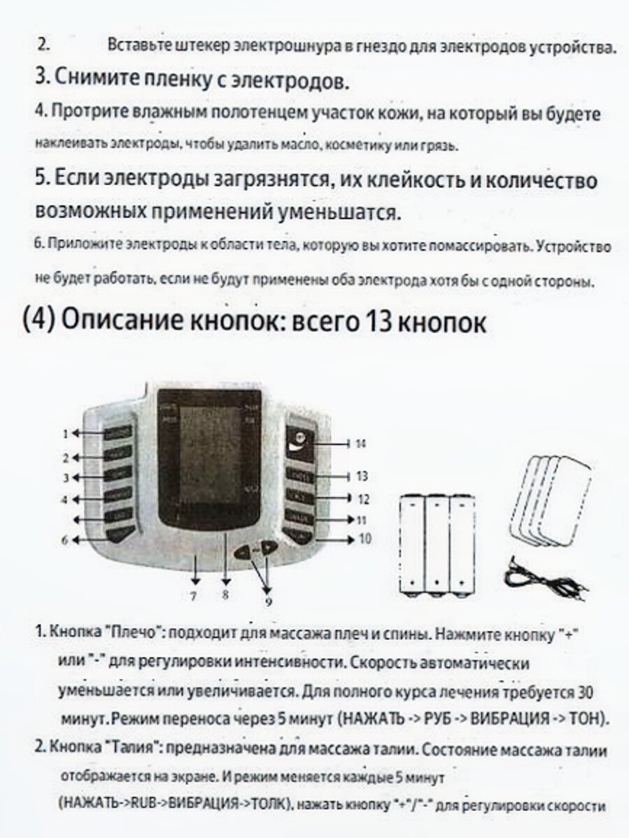 Миостимулятор массажёр, 8 пар электродов, тапочки, перчатки, регулируемая интенсивность. белый. интересное: