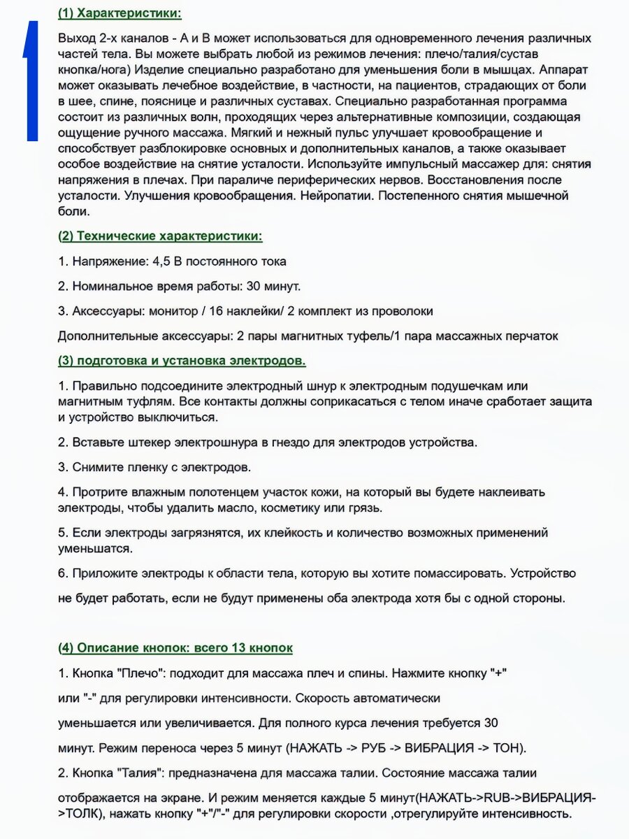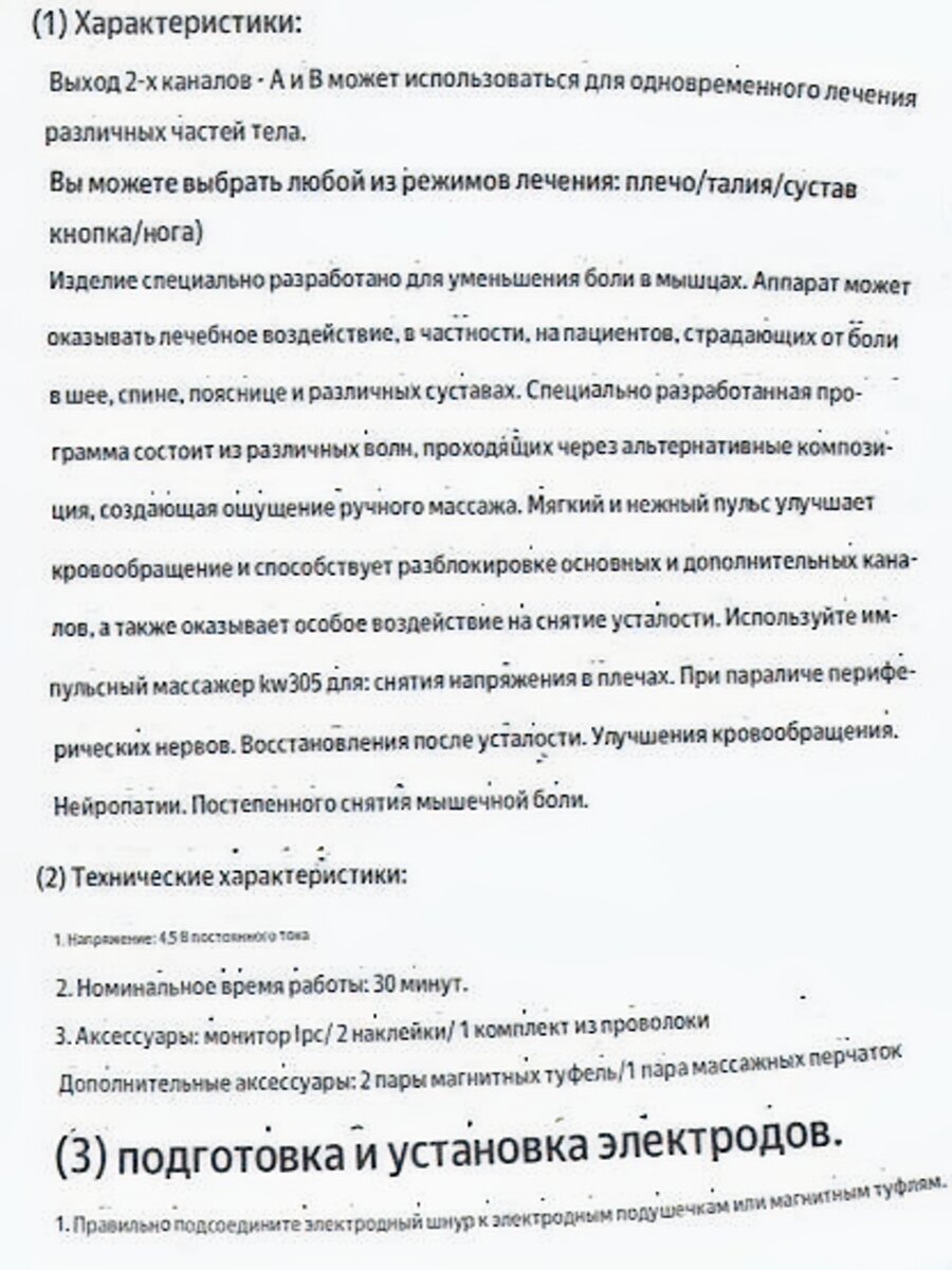 | Комплектация | мио стимулятор - 1шт. блок питания - 1 шт. электрод/липучка - 16шт. перчатки 1 пара. тапочки 1 пара. |