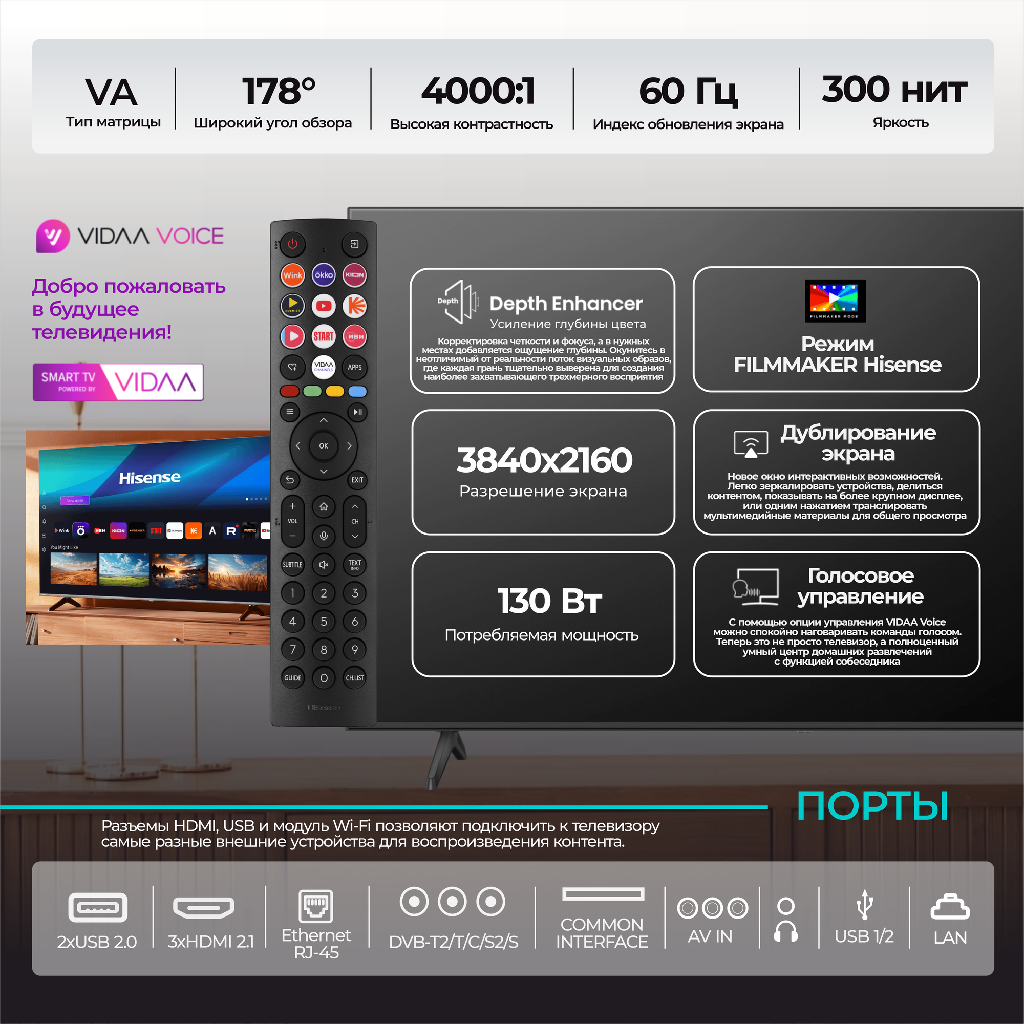 Телевизор ЖК 85'' Hisense/ 85", Ultra HD, Smart TV (ОС VIDAA U7), Wi-Fi, PCI 2000, DVB-T2/T/C/S2/S, 2х15W, CI+(1.4), 3хH