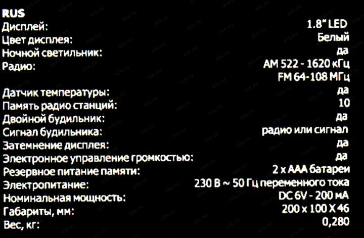| Особенности | дисплей, работа от сети, с часами, термометр |