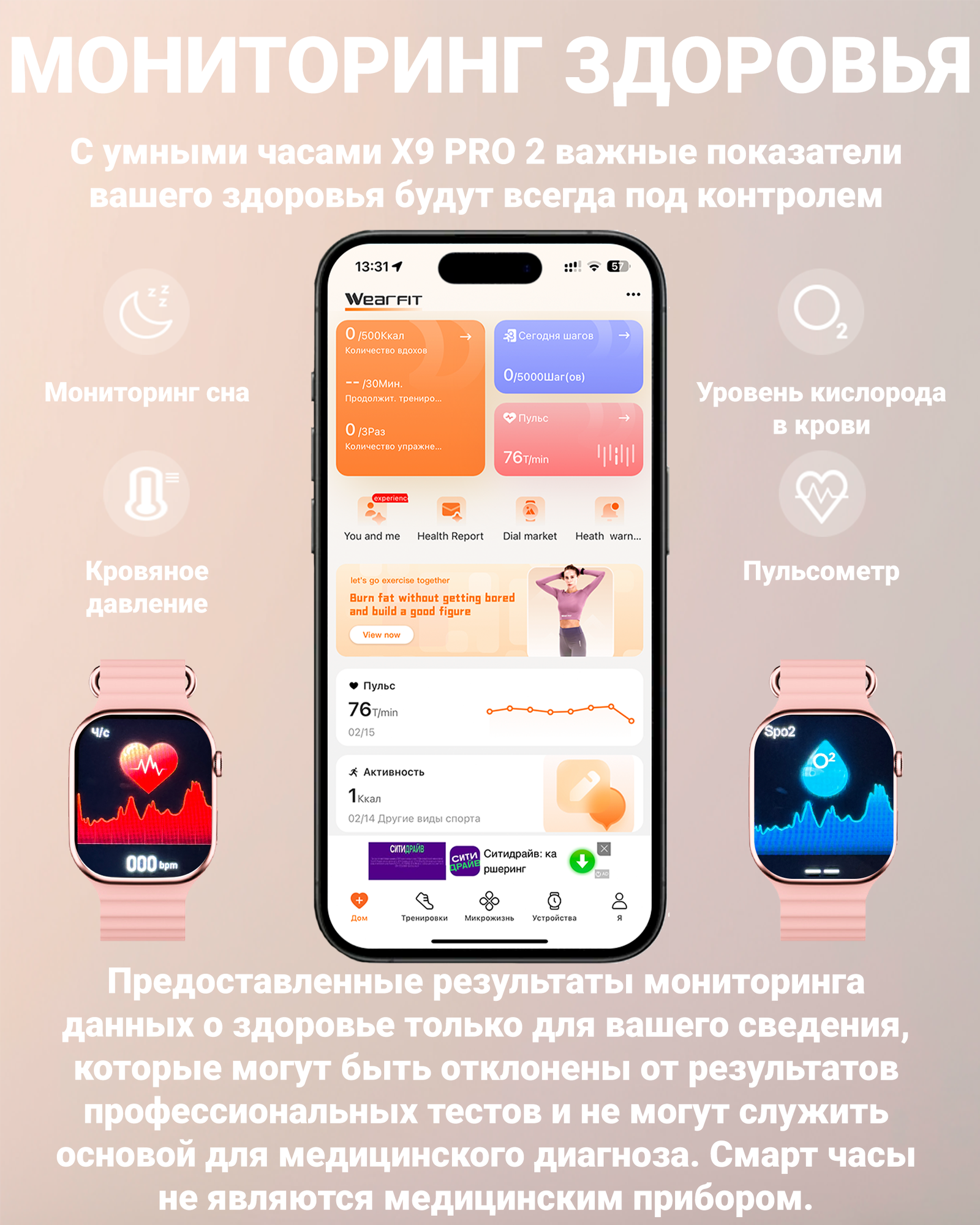 | Мониторинг | ЭКГ, калорий, пульса, сна, уровня кислорода в крови, физической активности, частоты дыхания |