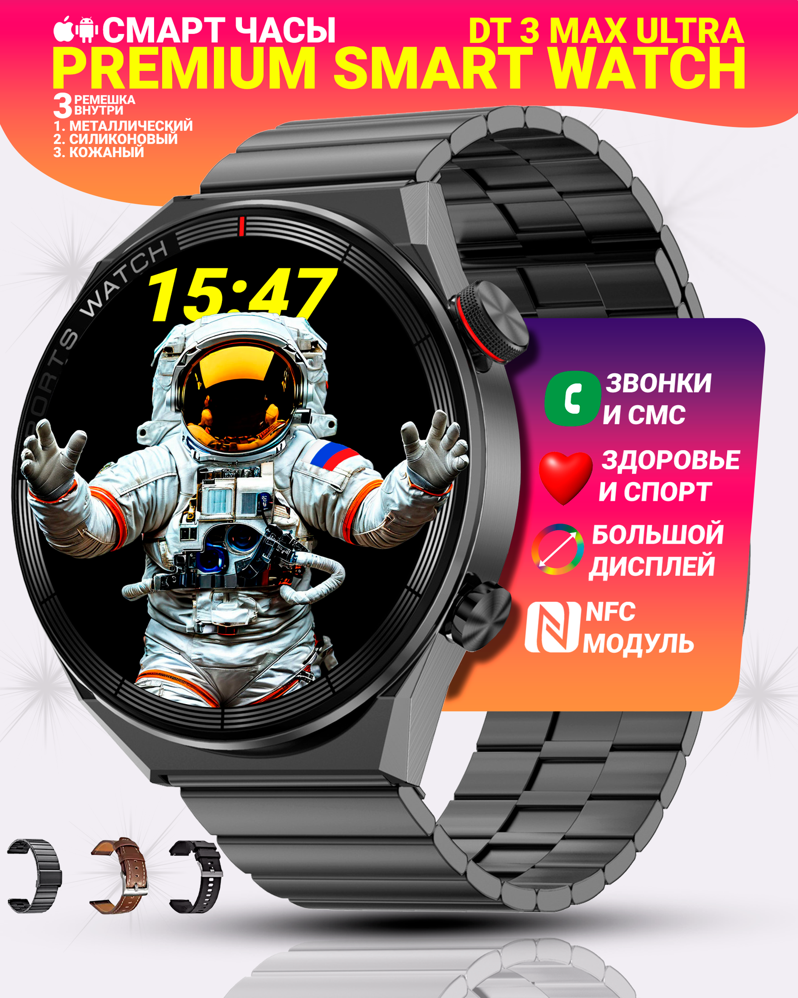 Умные смарт часы, Premium smart watch dt max ultra 3 ремешка, уведомления, iOS, Android, черные интересное: