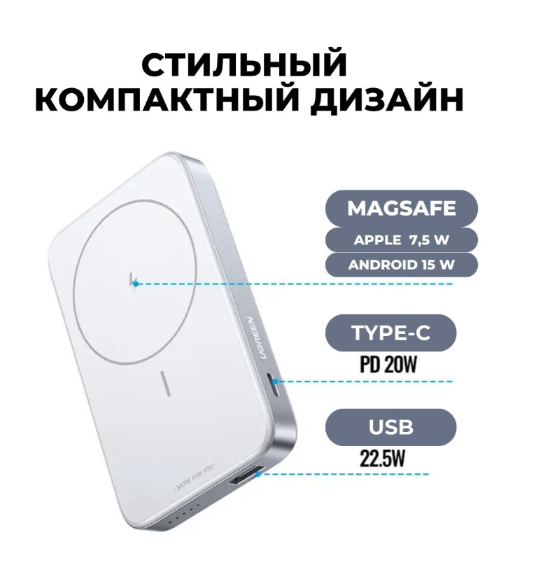 Внешний аккумулятор Ugreen PB206 (25154) White, 10000мАЧ, повербанк, повербанк для айфона, powerbank, павербанк, повербанк для телефона, магнитный повербанк