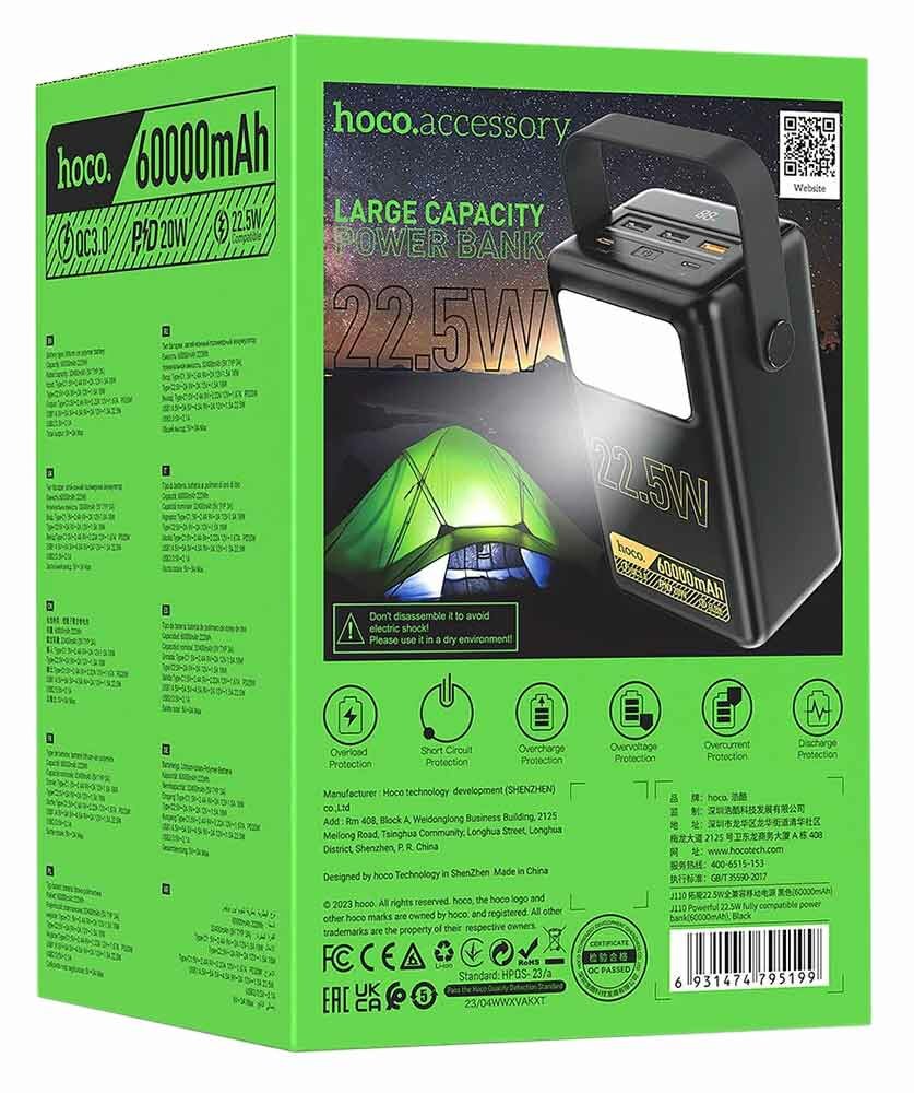 Внешний аккумулятор Hoco J110 Powerful 22.5W Power bank (60000 mAh) с фонарем, черный