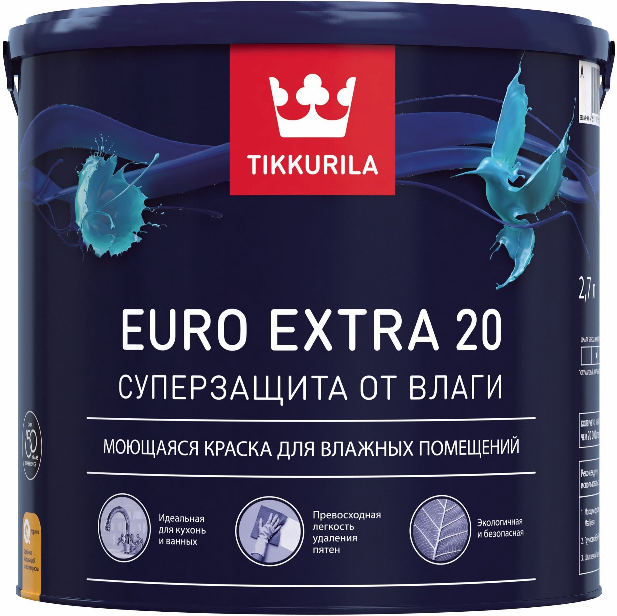 Краска TIKKURILA EURO EXTRA 20 моющаяся для влажных помещений, полуматовая база А 2,7л белая