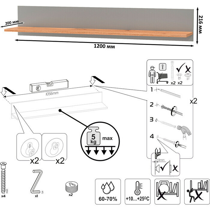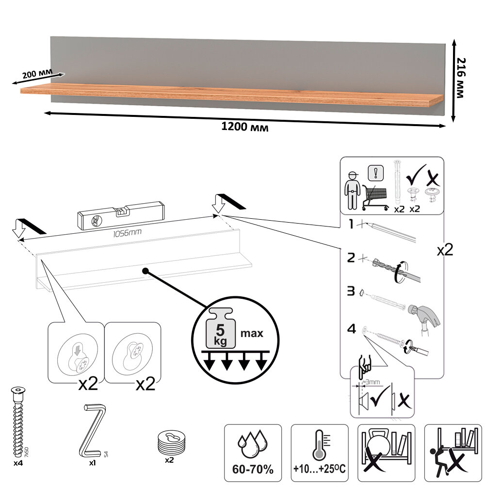 | Дополнительная информация | настенная открытая полка с задней панелью, полка располагается по центру панели; можно использовать как книжную, а также для размещения элементов декора, поделок и фоторгафий; имеет с обратной стороны панели скрытые крепленния; максимальная нагрузка на полку составляет 5 кг; поставляется в разобранном виде |