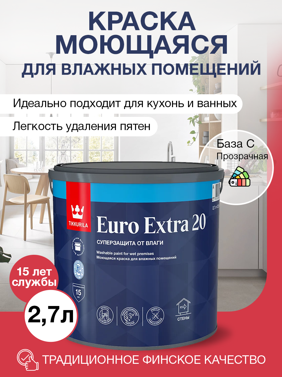Купить Краска Euro Extra-20 (Евро-20) TIKKURILA 2,7л бесцветный (база С)
