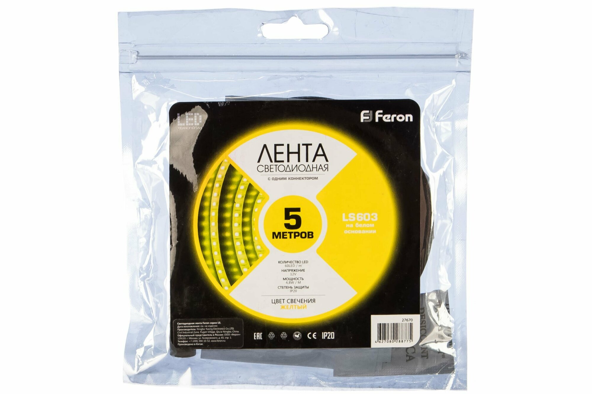 Cветодиодная LED лента Feron LS603, 60SMD(2835)/м 4.8Вт/м 5м IP20 12V желтый, 27670