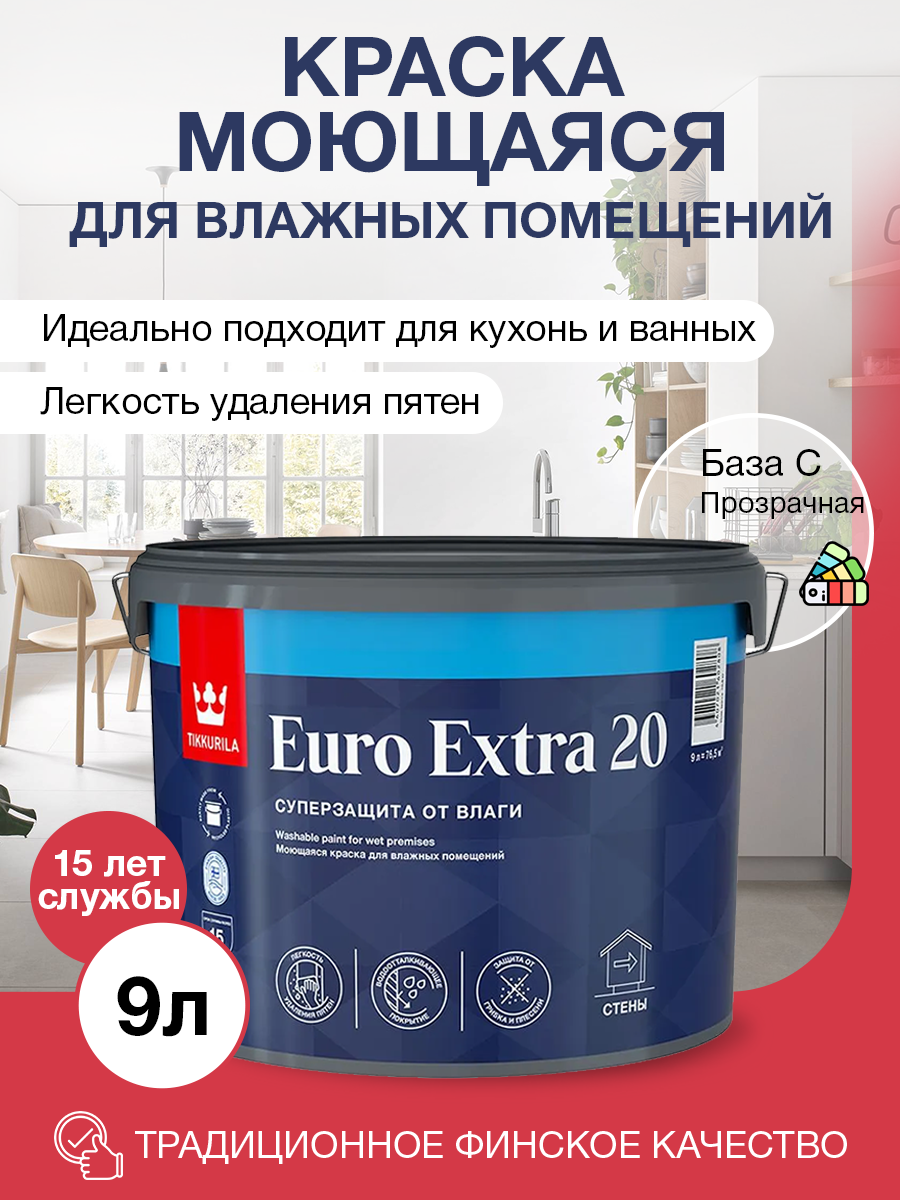 Краска TIKKURILA EURO EXTRA 20 моющаяся для влажных помещений, полуматовая база С 9л бесцветная