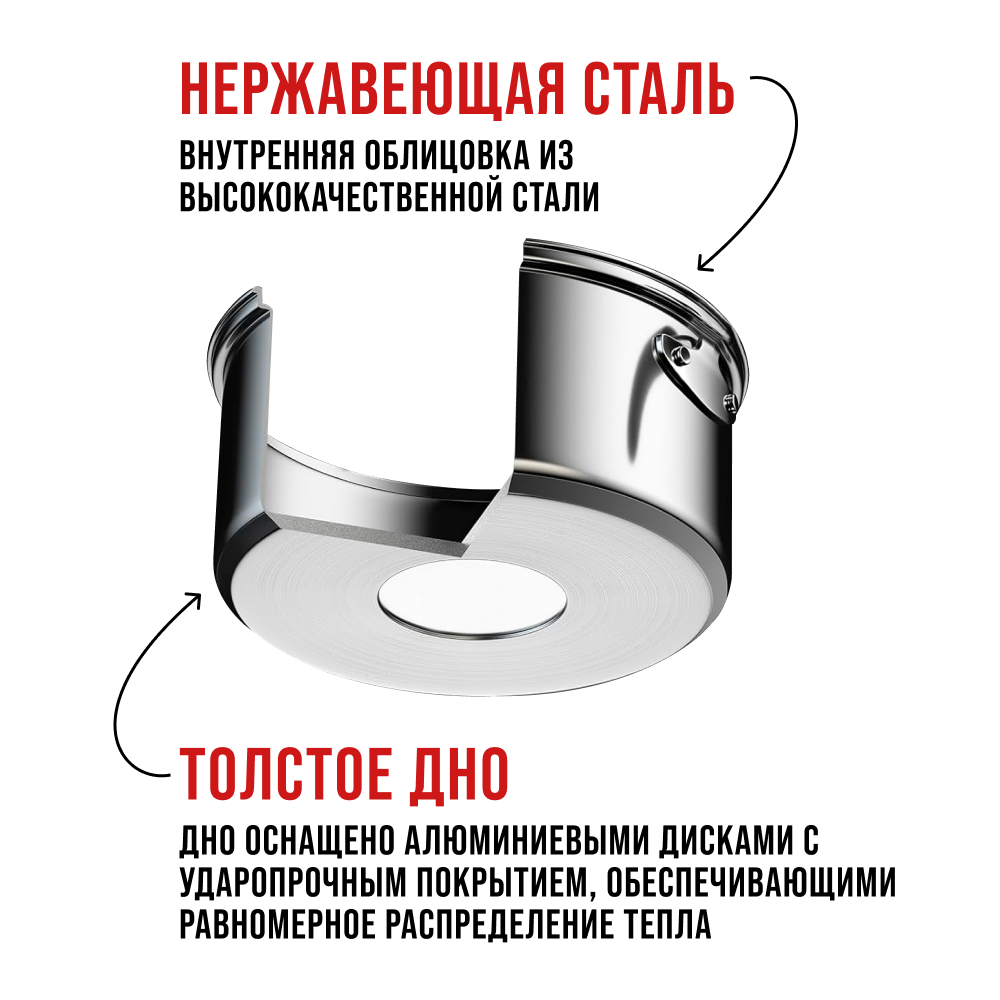 | Дополнительная информация | Дно: 5 слоев (нержавеющая сталь, алюминий, железо, алюминий, нержавеющая сталь). |