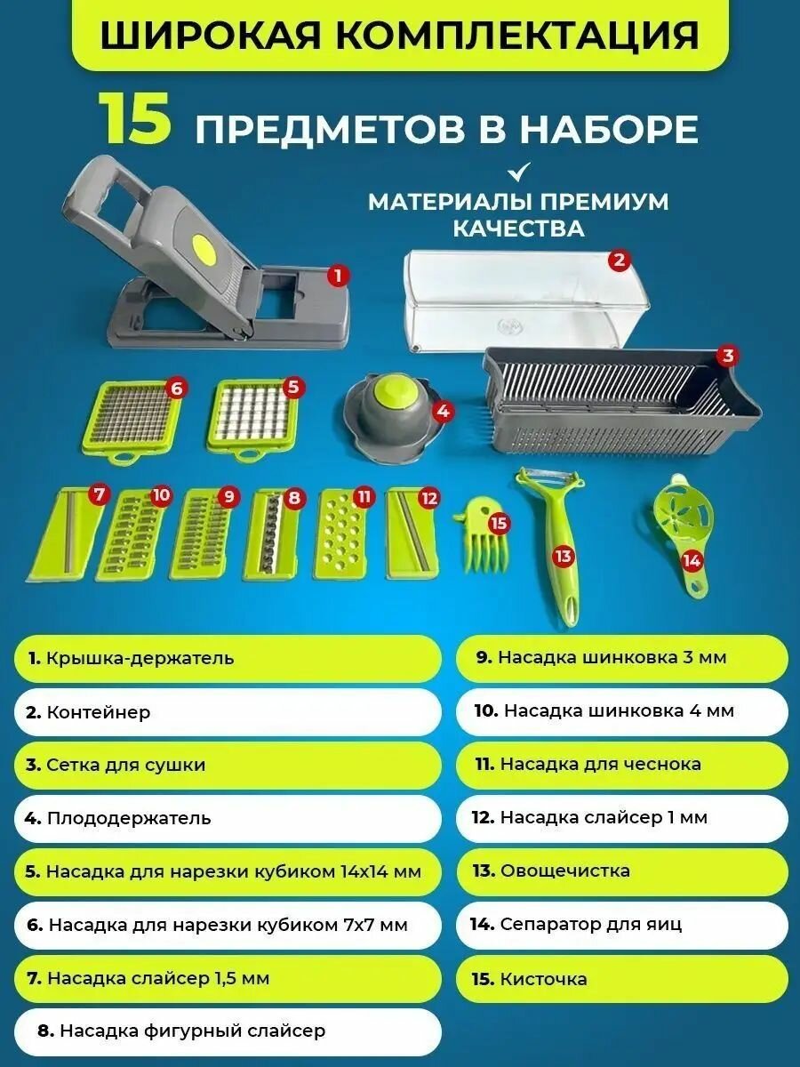 | Комплектация | двойной контейнер, герметичная крышка, насадки-ножи для нарезки кубиками 2 шт, насадки- терки 3 шт, насадки- слайсеры 3 шт, ситечко для яиц, овощечистка, прибор для защиты рук |
