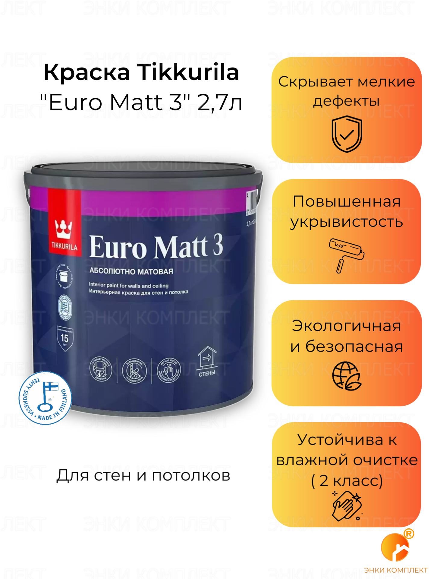 TIKKURILA EURO MATT 3 краска интерьерная для стен и потолков, абсолютно матовая, база C (2,7л)