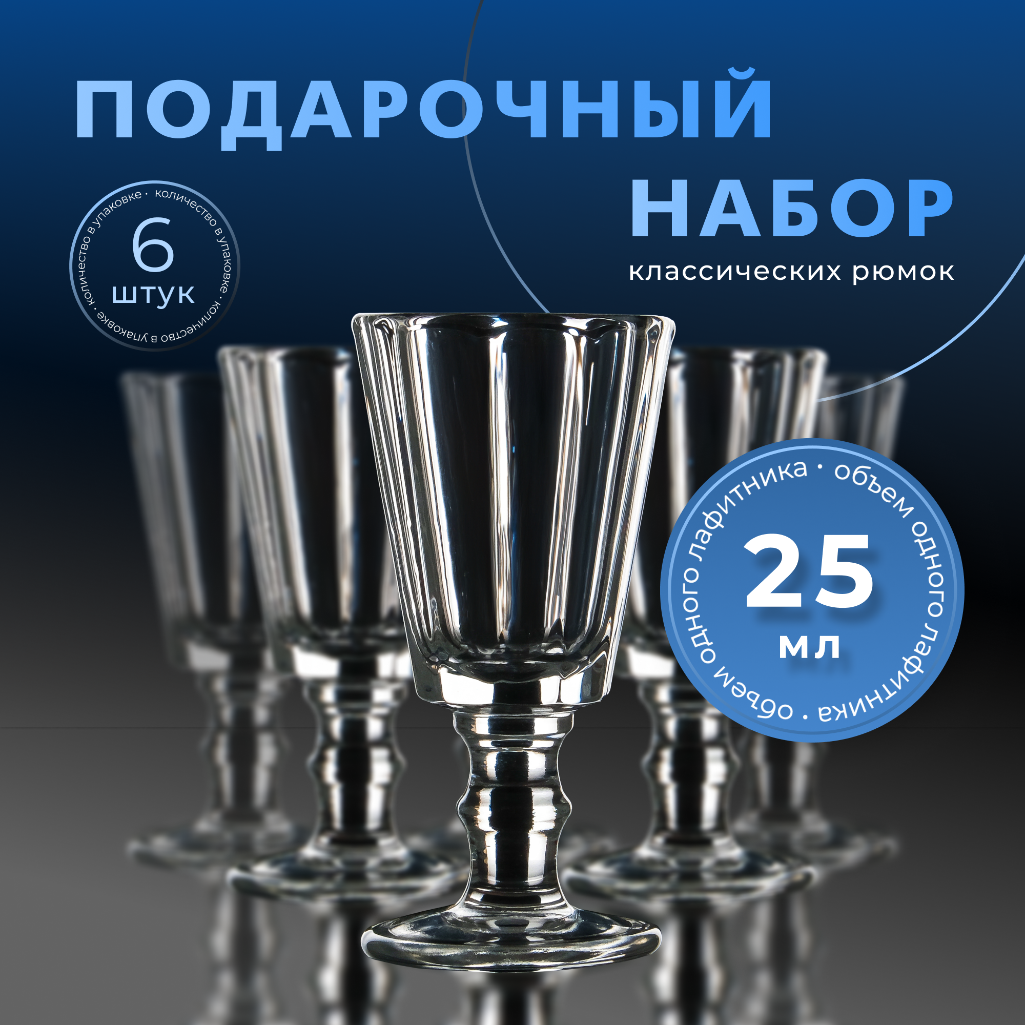 | Комплектация | Подарочная коробка, Рюмка-лафитник граненая 25 мл - 6 штук |