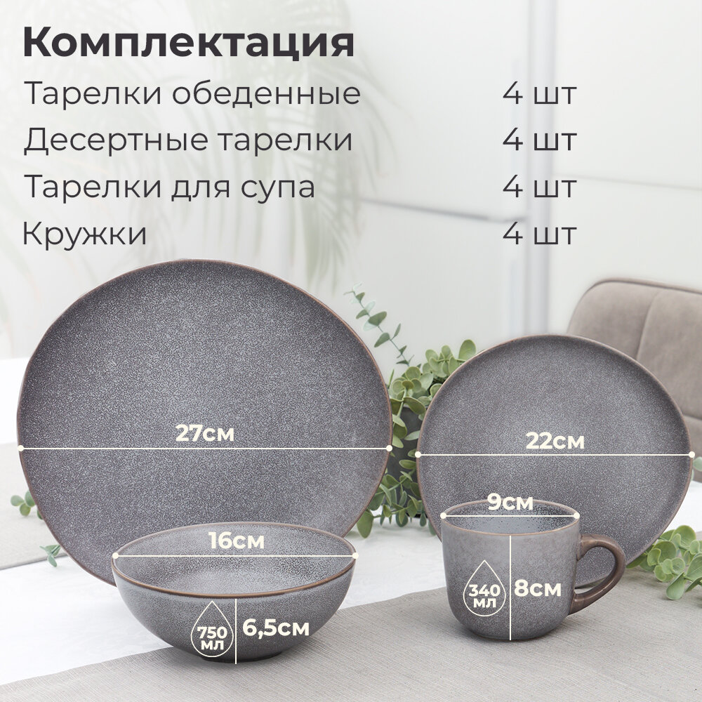 Набор посуды столовой на 4 персоны JEWEL Грей сервиз обеденный 16 предметов
