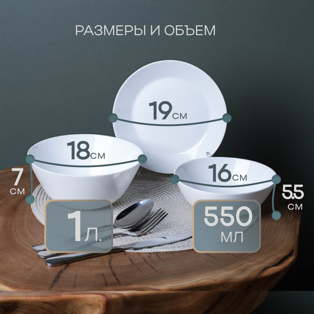 | Комплектация | 6шт глубоких тарелок 500мл, 6шт плоских тарелок 19см, 1шт салатник 1 литр. |