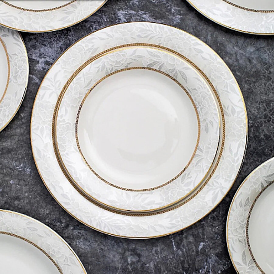 | Комплектация | 6 обеденных тарелок 27 см, 6 суповых тарелок 22 см, 6 десертных тарелок 19 см, 6 чайных пар (блюдце + чашка 220 мл) |