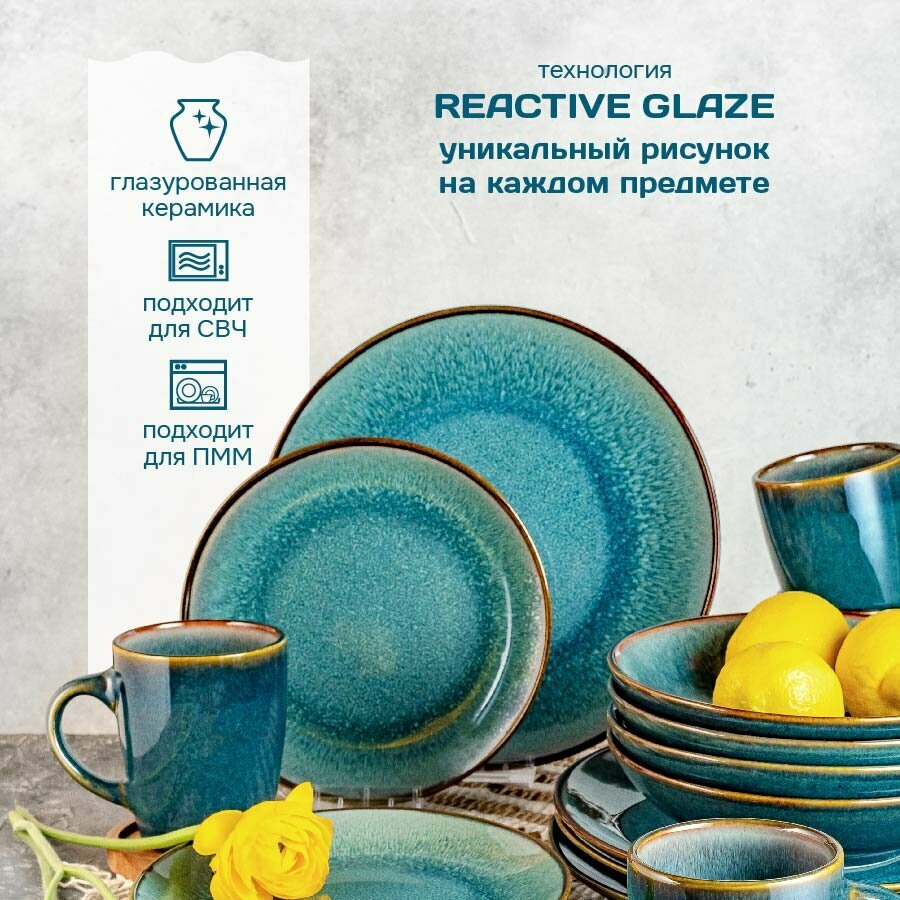 | Комплектация | Тарелка обеденная столовая керамическая 26,5см - 4шт, тарелка десертная керамическая 19см - 4шт., тарелка глубокая салатник керамический 15 см/730мл - 4шт., кружка 360мл - 4 шт., подарочная упаковка -1 шт. |