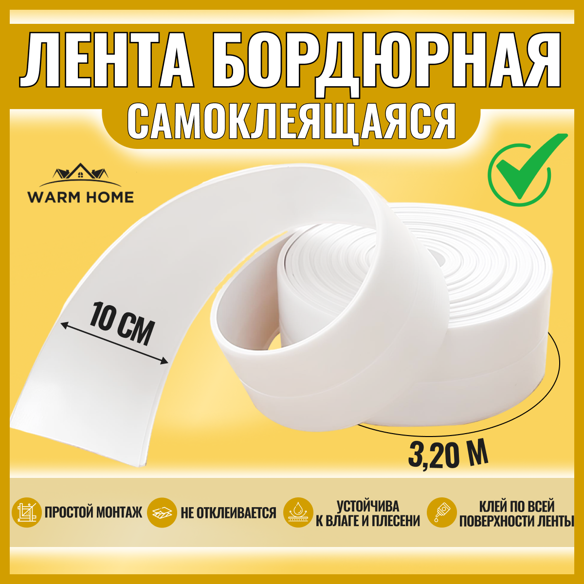 Купить Бордюрная лента для ванны , раковины , Warm Home , белая , 10см.*3,2м. Плинтус для столешницы кухни . Водонепроницаемая , устойчивая к плесени .