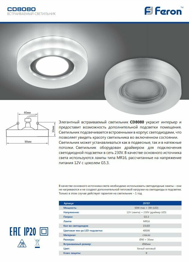 Ниже Вы можете прочитать отзывы на Светильник потолочный светодиодный, встраиваемый с белой LED подсветкой FERON CD8080, 50Вт, 4000К, MR16, G5.3 белый матовый, 2 шт, ознакомится с подробными характеристиками, посмотреть интересные обзоры и фотографии на Светильник потолочный светодиодный, встраиваемый с белой LED подсветкой FERON CD8080, 50Вт, 4000К, MR16, G5.3 белый матовый, 2 шт.