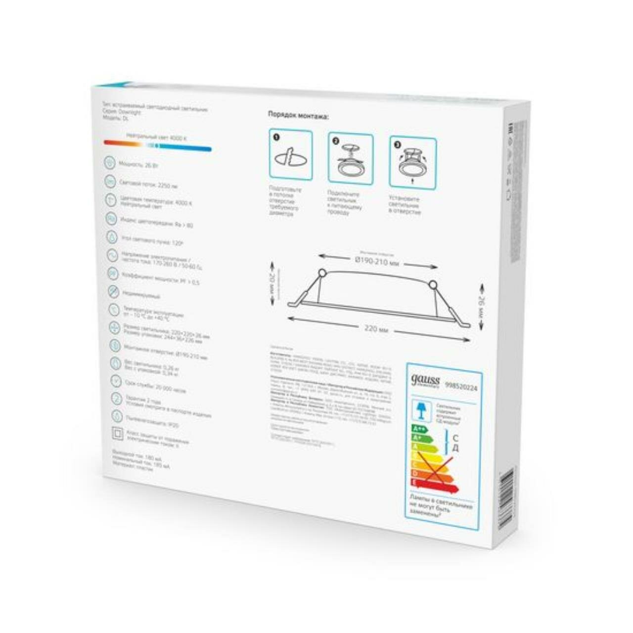 Светильник потолочный встраиваемый Downlight круг 26W 4000K 220V IP20 220*26 Gauss Elementary