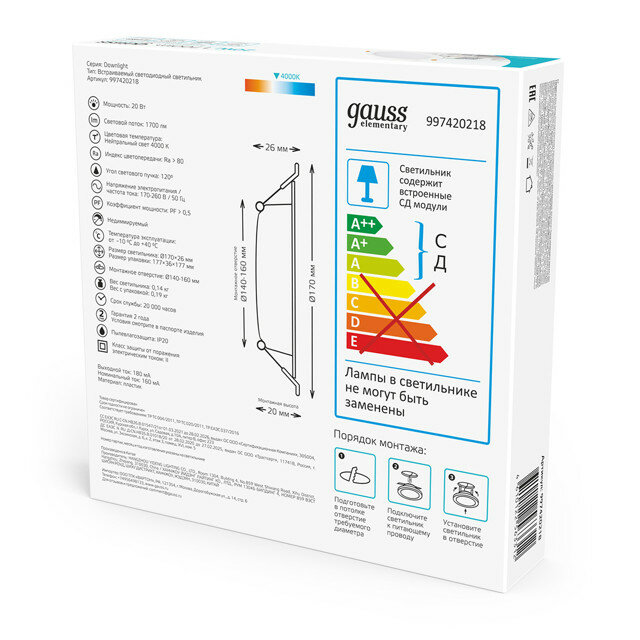 Ниже Вы можете прочитать отзывы на Светильник потолочный встраиваемый Downlight круг 20W 4000K 220V IP20 170*26 белый Gauss Elementary, ознакомится с подробными характеристиками, посмотреть интересные обзоры и фотографии на Светильник потолочный встраиваемый Downlight круг 20W 4000K 220V IP20 170*26 белый Gauss Elementary.