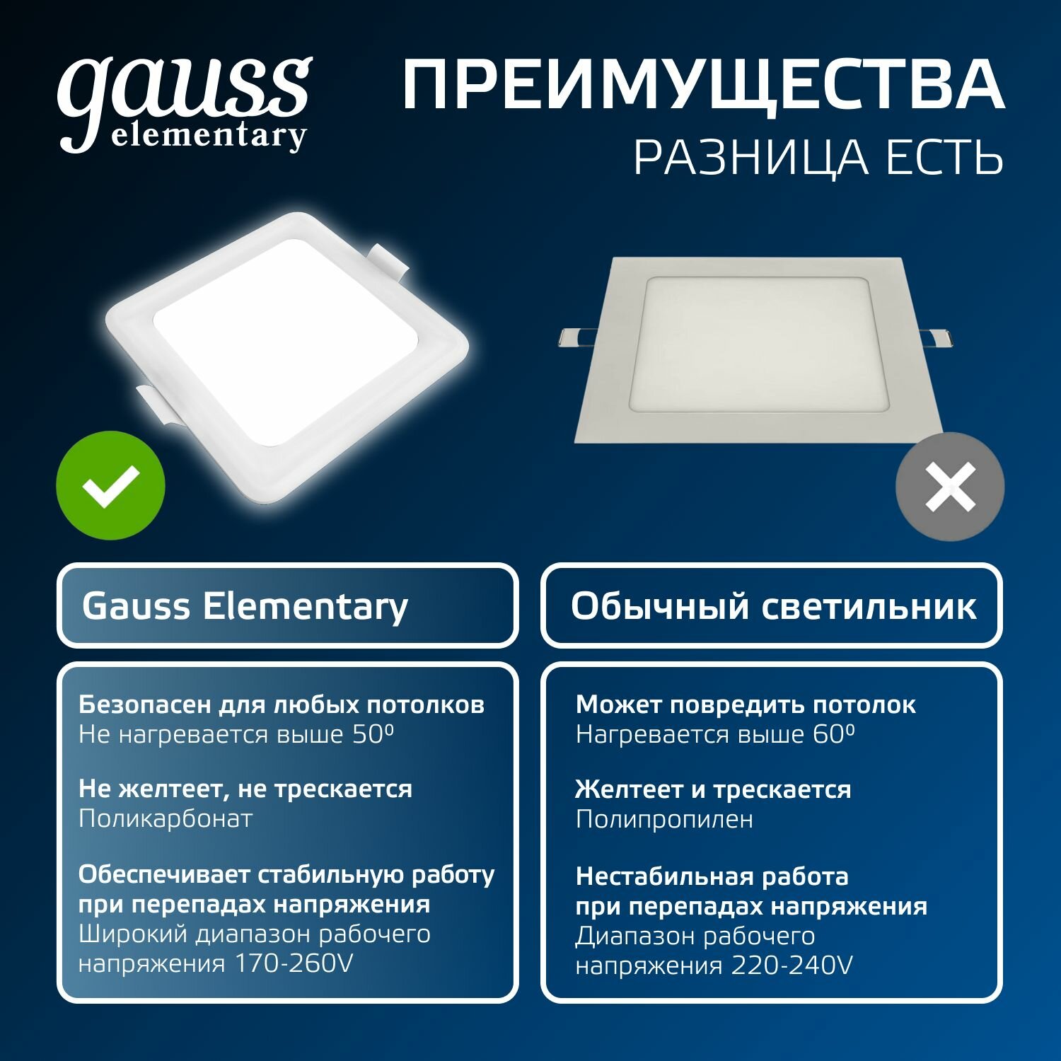 Светильник светодиодный ДВО 18 Вт 4000К 1600 лм 170-260В IP20 170х170х26мм монт разм 140х140мм Пластик Elementary Gauss
