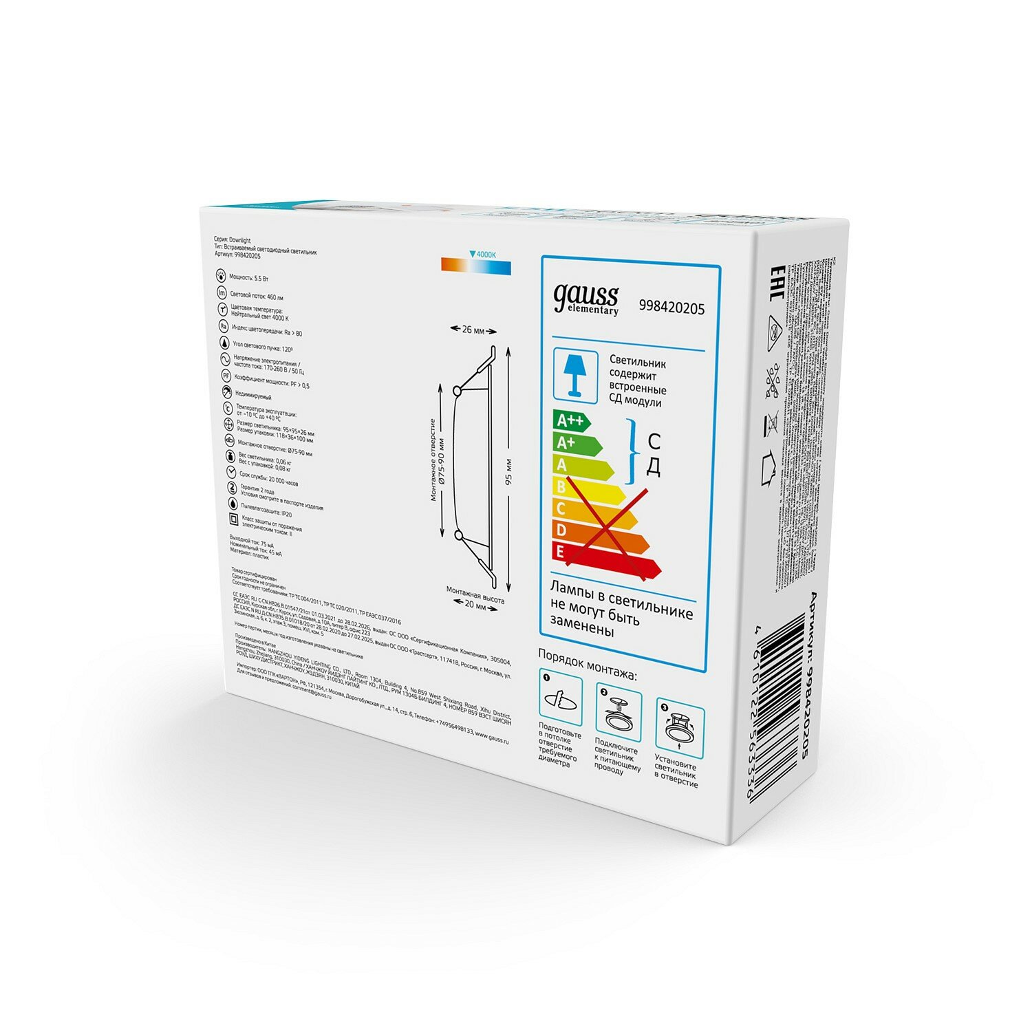 Светильник Gauss Elementary Downlight круг 5W 430lm 4000K 210-240V IP20 95*38 монтаж бел.LED (3шт. в упак.) LED 1/40