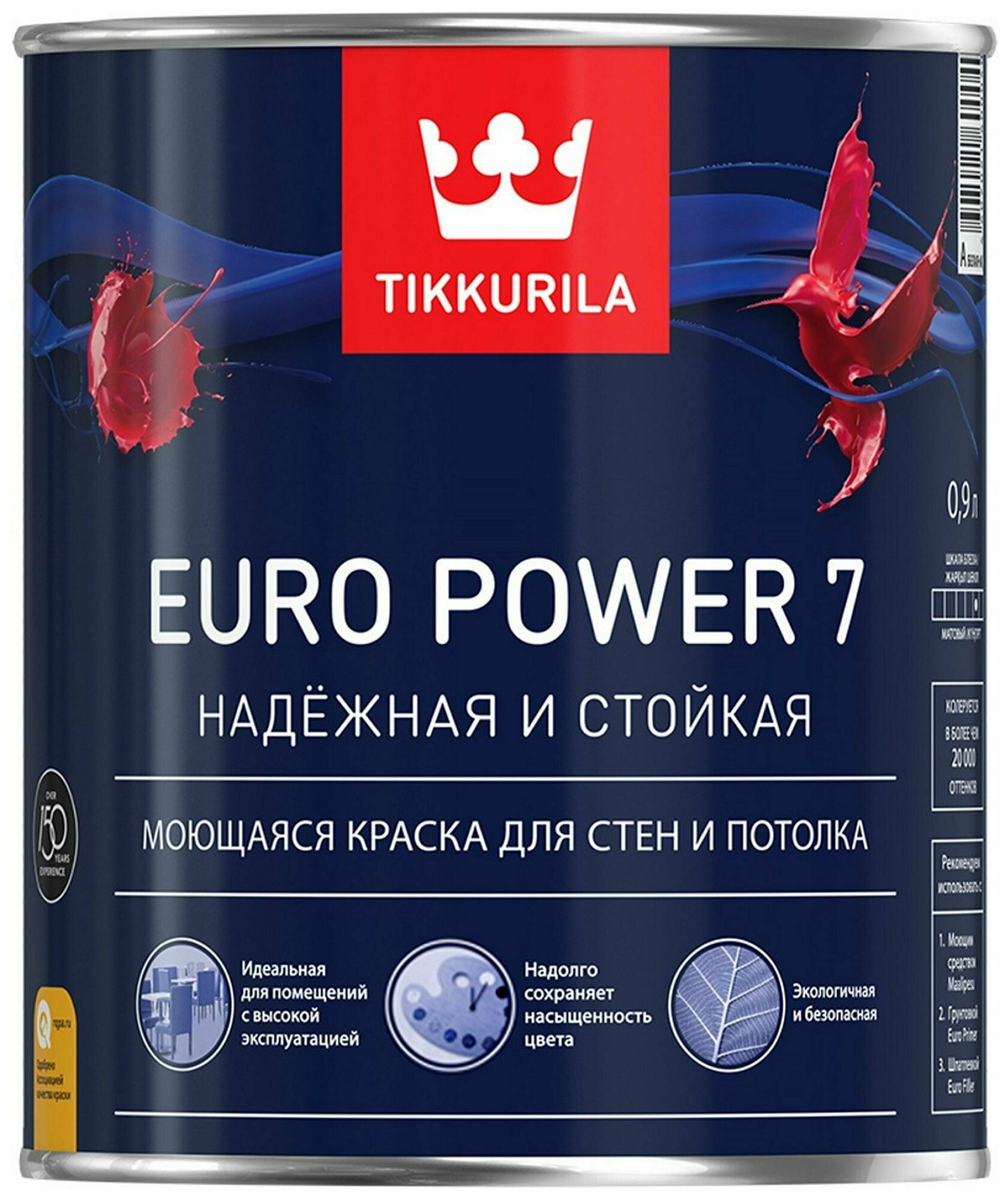 Краска TIKKURILA EURO POWER 7 моющаяся для стен и потолка, матовая, база A 0,9л 700001118