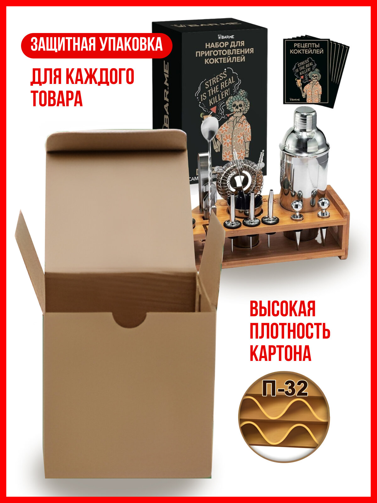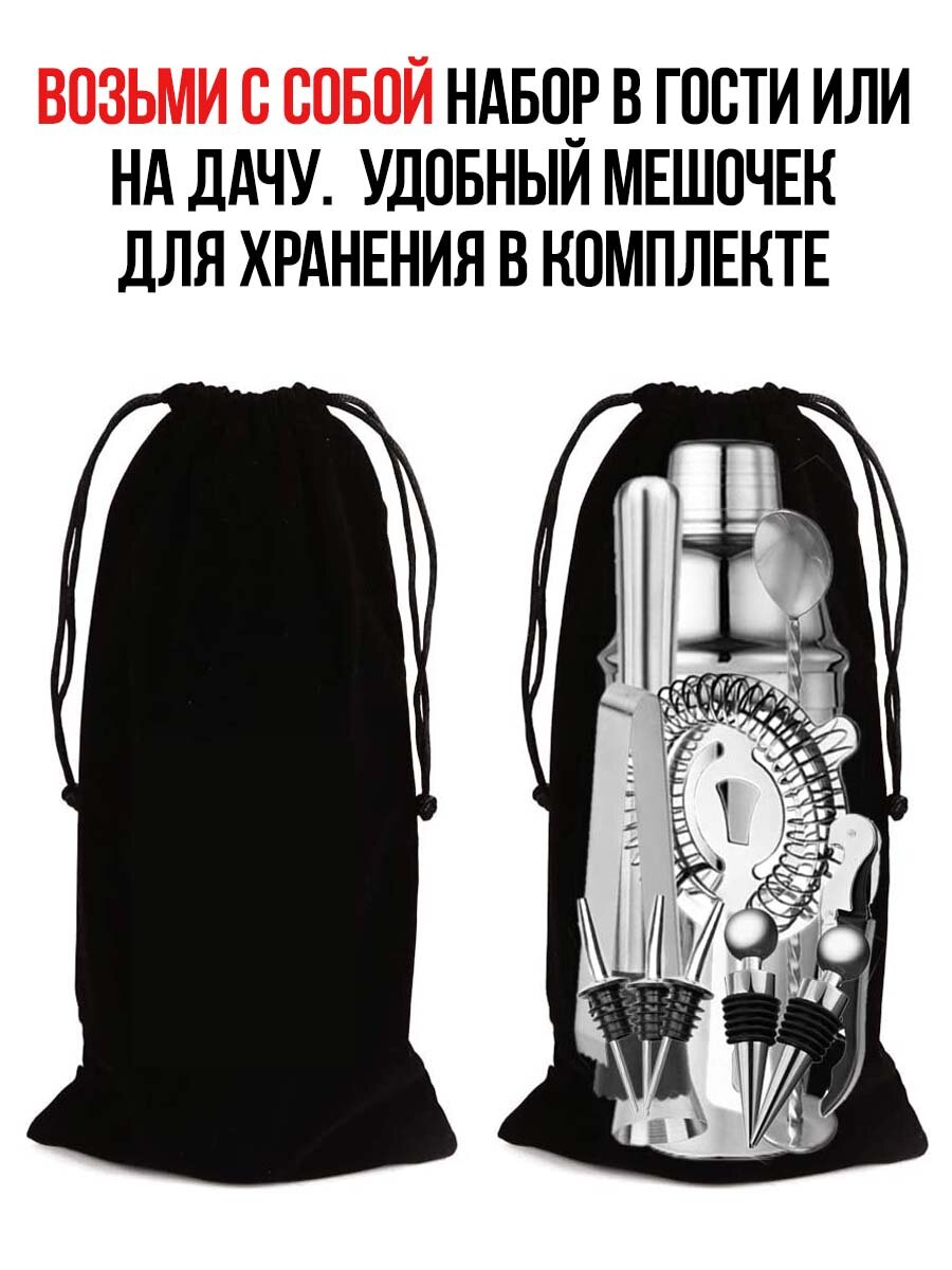 | Подробная комплектация | Шейкер барный 750 мл, маддлер, джиггер 15/30, барная ложка, штопор, щипцы для льда, стрейнер, гейзеры 2 шт. и подставка из бамбука. |