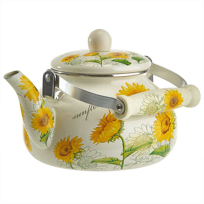 Чайник эмалированный EM-1313 "Подсолнухи", 2.5 л, керамическая ручка, для всех типов плит, цветочный принт, желтый
