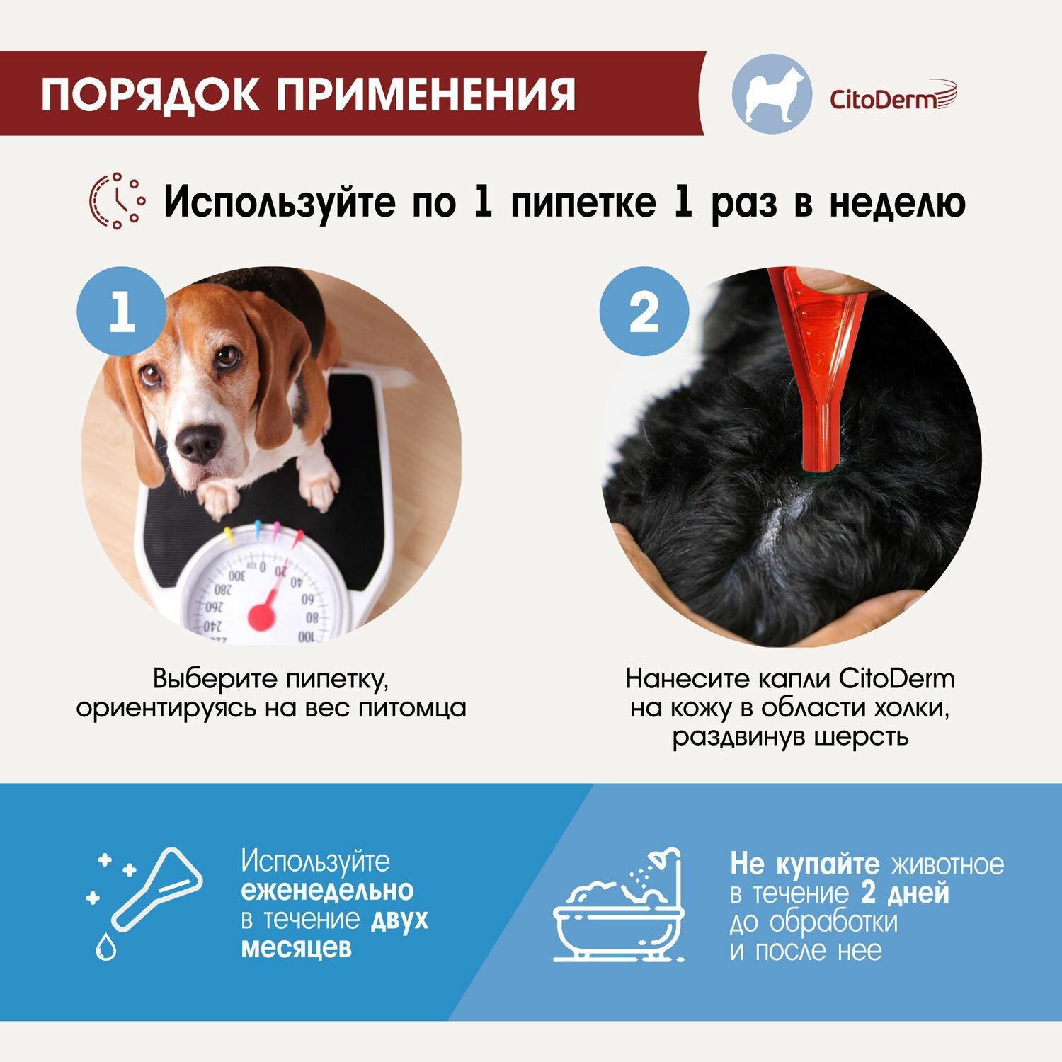 | Способ применения | - не купайте животное в течение 2 дней до обработки и после нее; - нанесите средство в 3–4 местах, недоступных для слизывания: на холку, вдоль позвоночника; - используйте еженедельно в течение двух месяцев; - для закрепления результата продолжайте использовать средство 1 раз в 2 недели; - курс применения не ограничен |