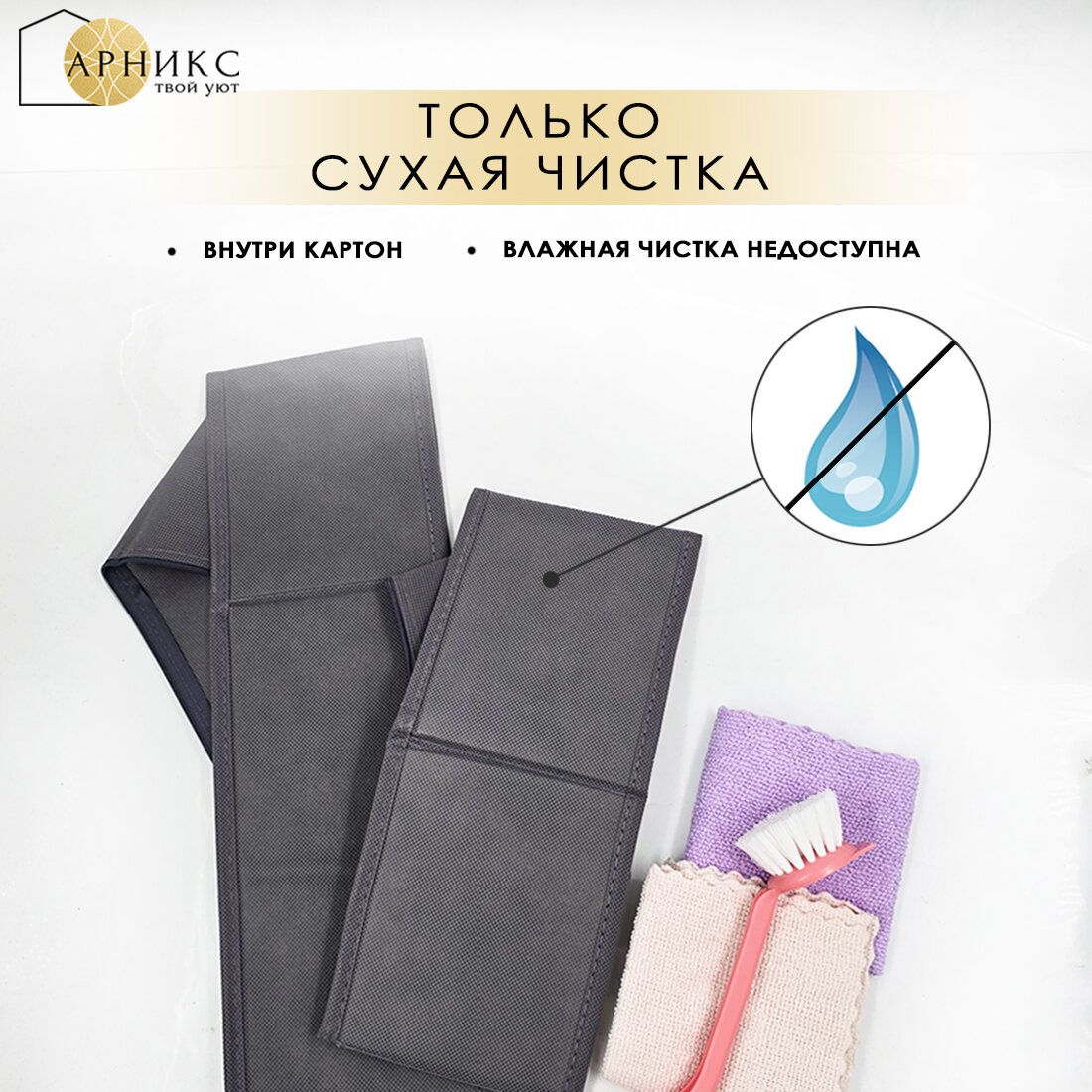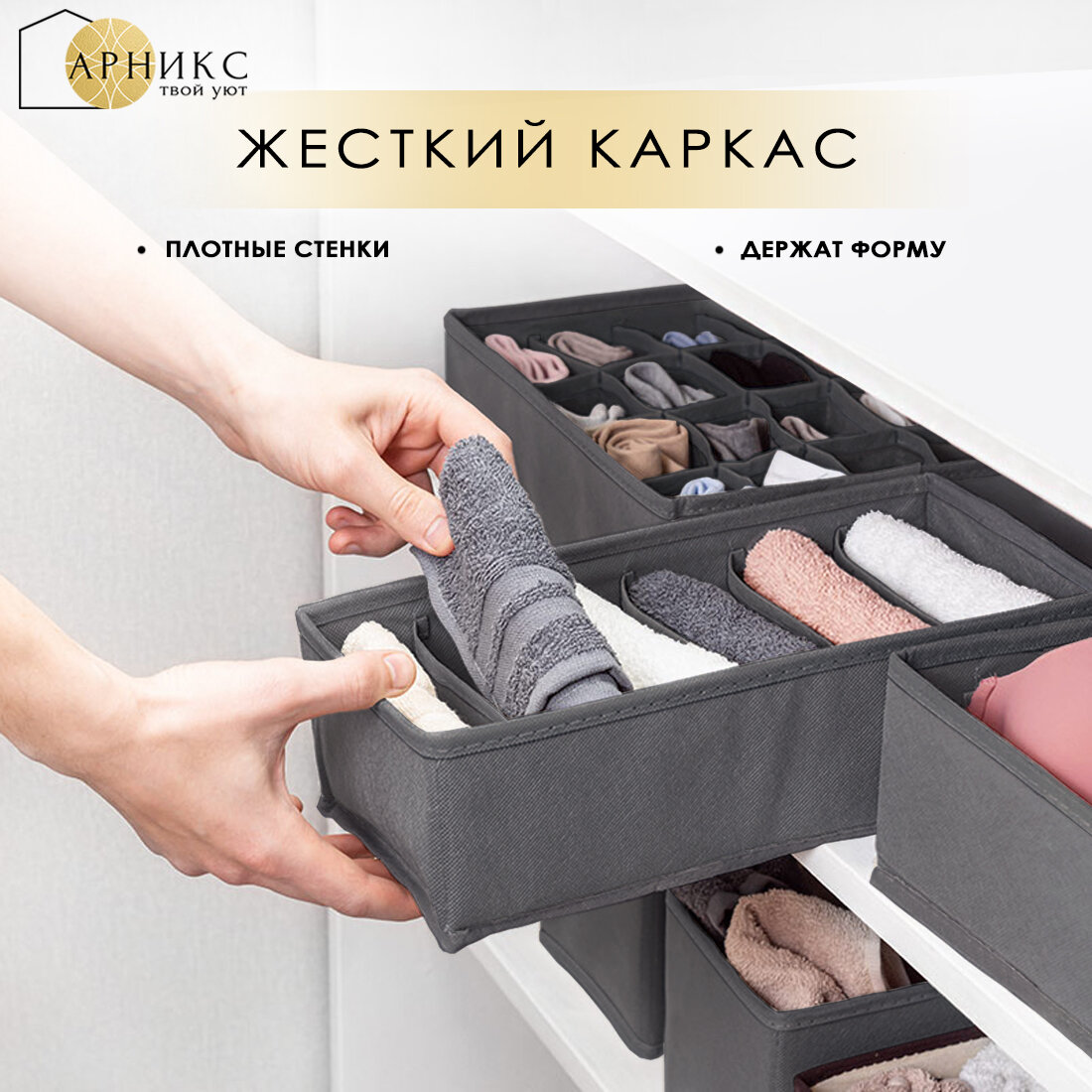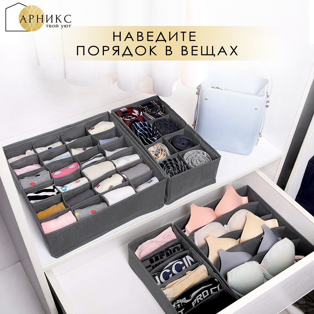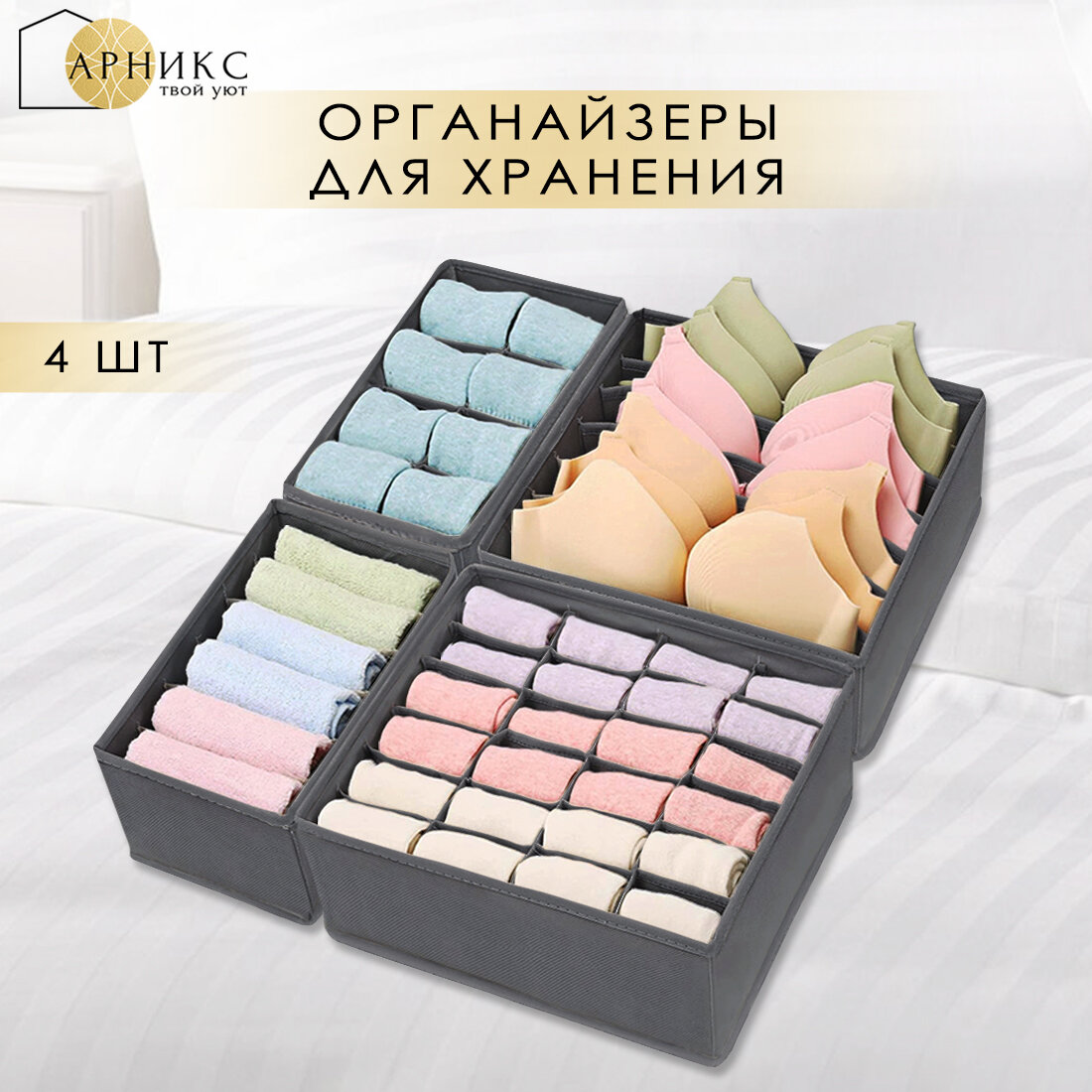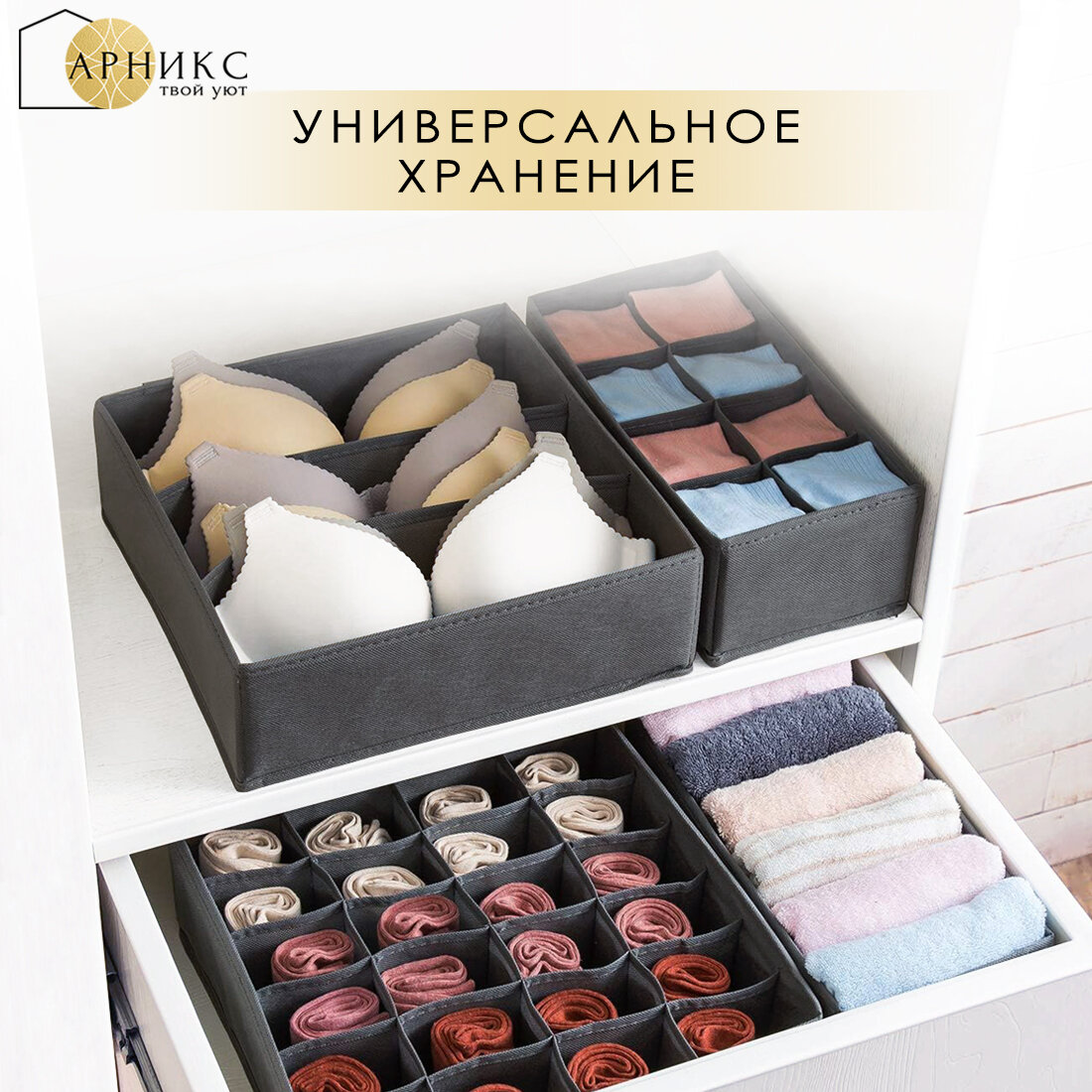 Органайзер Арникс для хранения вещей и одежды, складной, с разделителями/ Кофр для бюстгальтеров, нижнего белья и носков/ Набор 6 шт/ Темно-серый