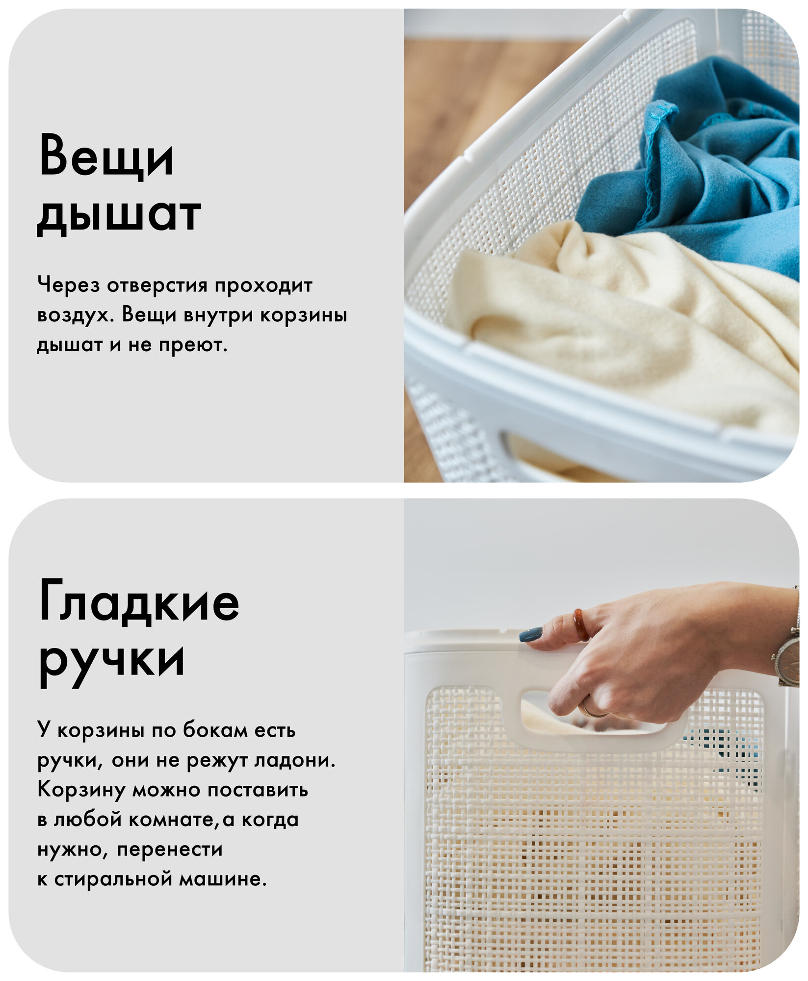 | Особенности | плетеная / ручки для переноски / с крышкой / складной / узкая |