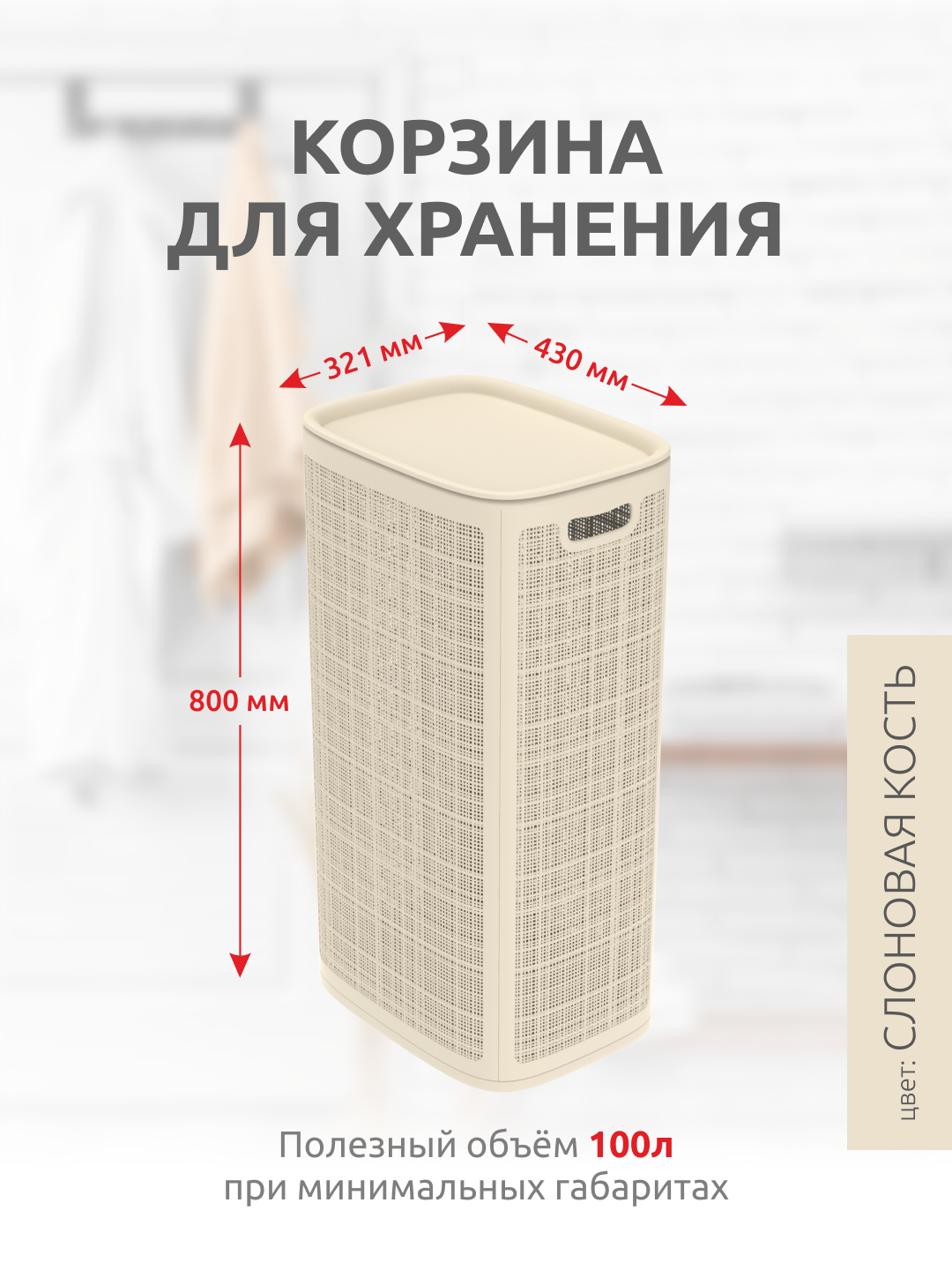 Корзина для белья «Лён», 100л, слоновая кость, Альт-Пласт, сборная, полипропилен