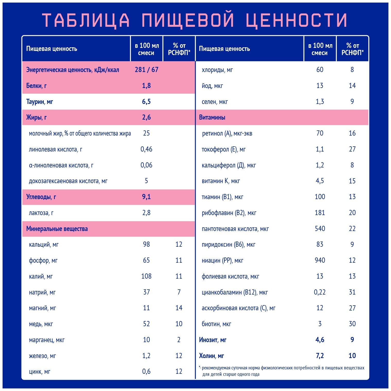 | Состав | вода, глюкозный сироп, сухое обезжиренное молоко, растительные масла (подсолнечное высокоолеиновое, соевое, кокосовое), молочный жир, минеральные вещества (фосфат кальция, цитрат натрия, хлорид калия, карбонат кальция, цитрат калия, сульфат железа, сульфат цинка, сульфат меди, хлорид марганца, йодид калия, селенит натрия), натуральный ароматизатор (ваниль), витаминный комплекс (аскорбиновая кислота, токоферола ацетат, никотинамид, D-пантотенат кальция, пиридоксина гидрохлорид, рибофлавин, фолиевая кислота, тиамина гидрохлорид, ретинола ацетат, D-биотин, филлохинон, холекальциферол, цианокобаламин), рыбий жир (источник докозагексаеновой кислоты DHA), эмульгаторы (соевый лецитин), таурин, инозит, холина битартрат, антиокислитель (L-аскорбилпальмитат) |