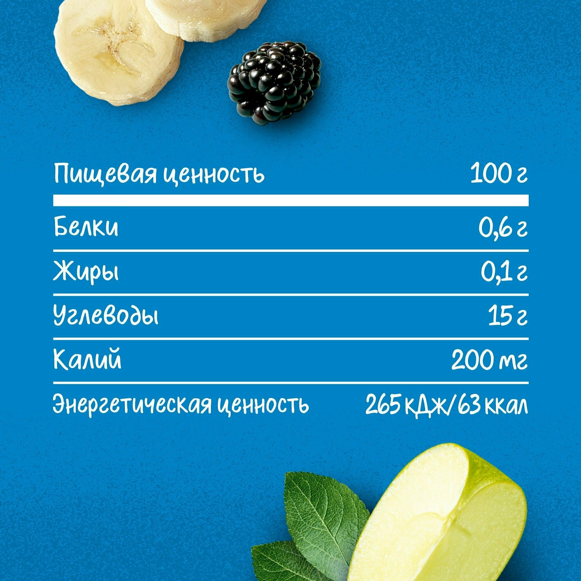 | Состав | пюре из яблок (46,9%), пюре из бананов (38%), пюре из черники (10%), пюре из ежевики (5%), концентрированный лимонный сок, антиокислитель (L-аскорбиновая кислота) |
