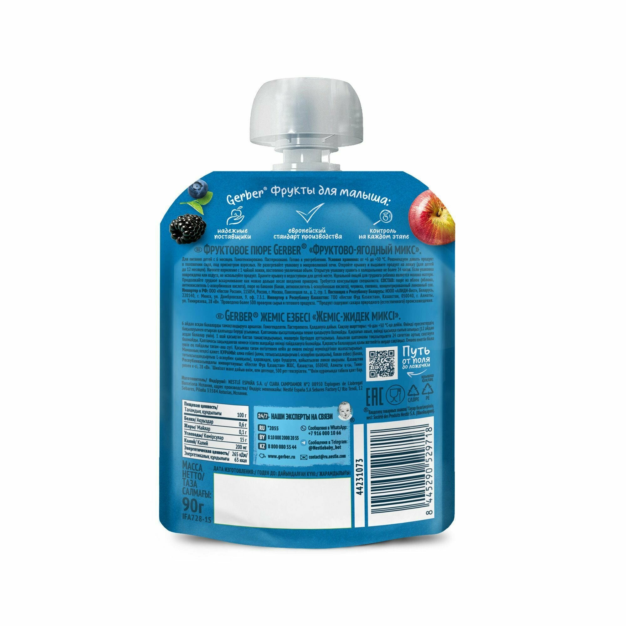 | Состав | пюре из яблок (46,9%), пюре из бананов (38%), пюре из черники (10%), пюре из ежевики (5%), концентрированный лимонный сок, антиокислитель (L-аскорбиновая кислота) |