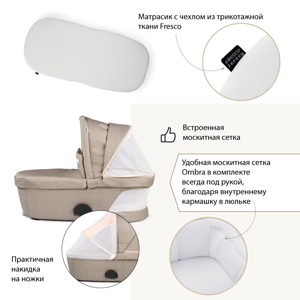| Комплектация | люлька, металлическая подставка для комфортного сна малыша в домашних условиях, москитная сетка Ombra |