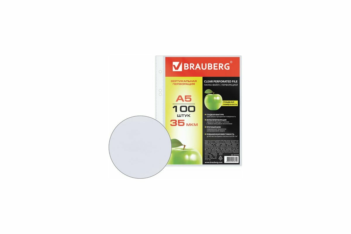 Папки-файлы Brauberg Перфорированные А5, вертикальные, 100 шт, гладкие, Яблоко, 35 мкм (221714)
