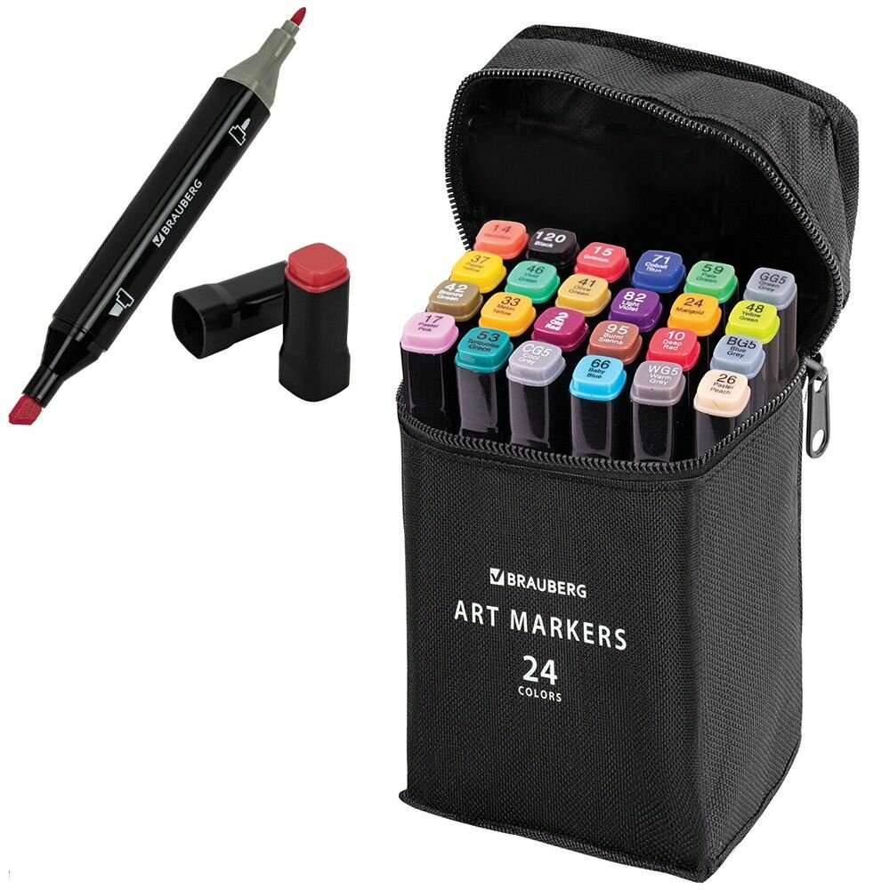 Маркеры для скетчинга Brauberg двусторонние, набор 24 шт, базовые цвета, в чехле, ART, 152295