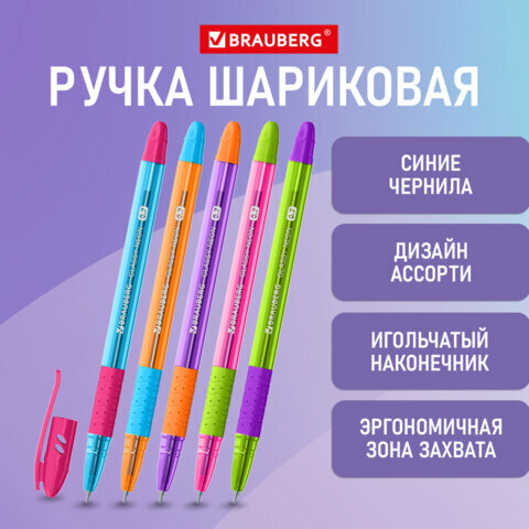 Ручка шариковая масляная с грипом BRAUBERG GLASSY MIX синяя комплект 12 шт., корпус ассорти, линия письма 0,35 мм