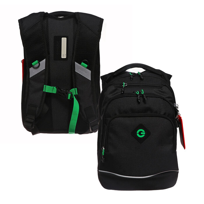 Купить Школьный рюкзак с эргономичной спинкой GRIZZLY RB-450-1/3 черный - зеленый, грудная стяжка, 2 отделения, 636 грамм, 40x25x22см, 14.5л.