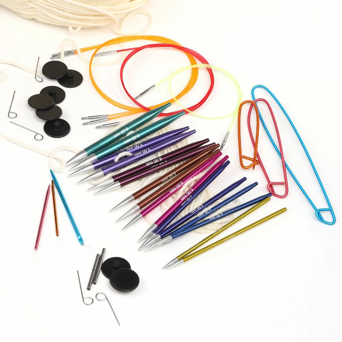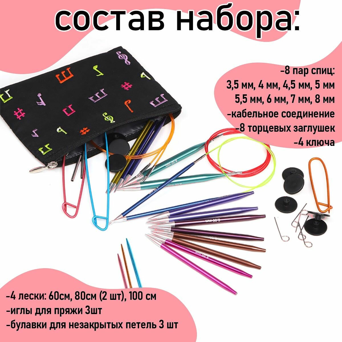 | Комплектация | в набор входит 8 пар съемных алюминиевых спиц стандартной длины (длина спицы 12,5 см): 3,5мм, 4мм, 4,5мм, 5мм, 5,5мм, 6мм, 7мм, 8мм; 4 разноцветных тросика, с помощью которых можно создать круговые спицы длиной 60см, 80см – 2шт, 100см; заглушки (8шт) и ключи к каждой леске, набор соединителей, набор игл для пряжи набор держателей петель. шкатулка |