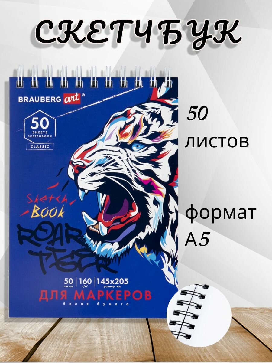 Скетчбук для маркеров, бумага 160 г/м2, 145х205 мм, 50 л., гребень, подложка, BRAUBERG ART CLASSIC, "Тигр", 115076