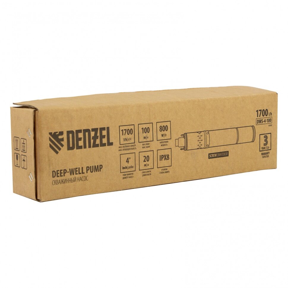 denzel скважинный насос dws-4-100, винтовой, диаметр 4", 800 вт, 1700 л/ч, напор 100 м 97252 насосы