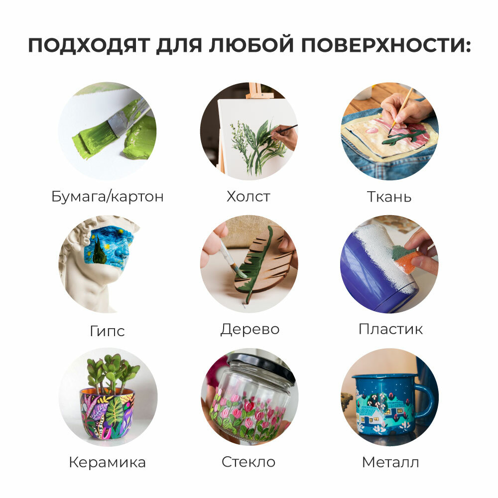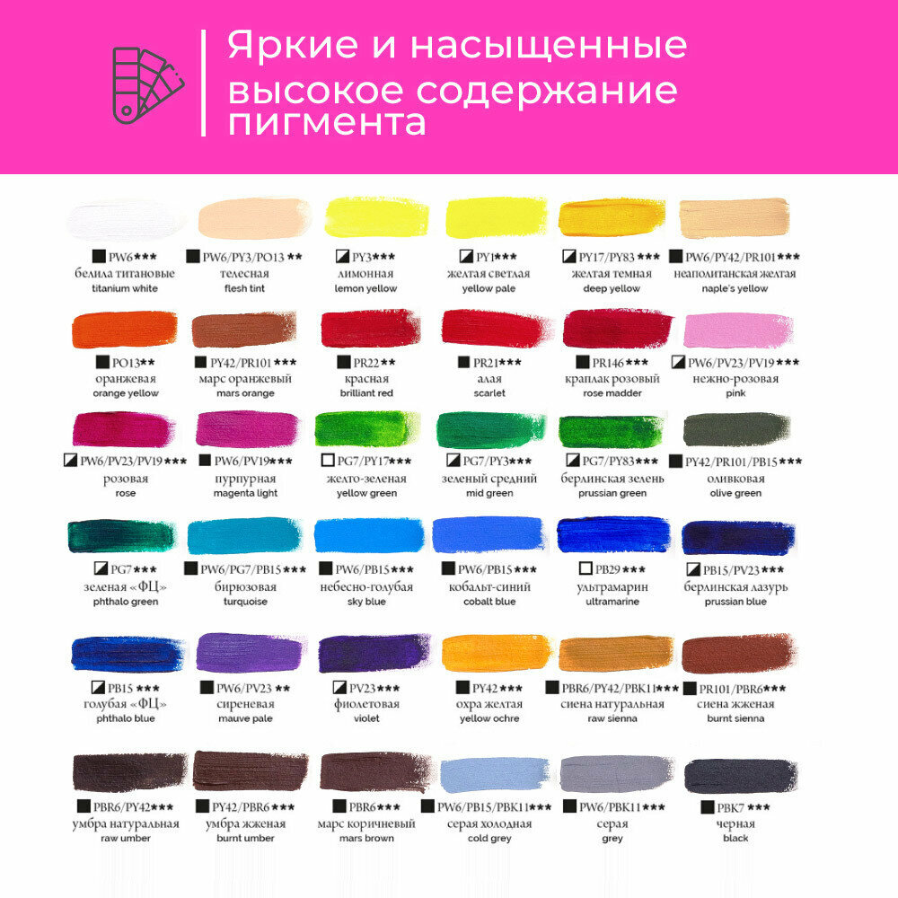 | Комплектация | Акриловые краски для рисования (художественный акрил) в тюбиках объемом 12 мл, цвета: белила титановые, телесная, лимонная, желтая светлая, желтая темная, неаполитанская желтая, оранжевая, марс оранжевый, красная, алая, краплак розовый, нежно-розовая, розовая, пурпурная, желто-зеленая, зеленый средний, берлинская зелень, зеленая ФЦ, оливковая, бирюзовая, небесно-голубая, кобальт синий, ультрамарин, голубая ФЦ, берлинская лазурь, сиреневая, фиолетовая, охра желтая, сиена натуральная, сиена жженая, умбра натуральная, умбра жженая, марс коричневый, серая холодная, серая, черная |