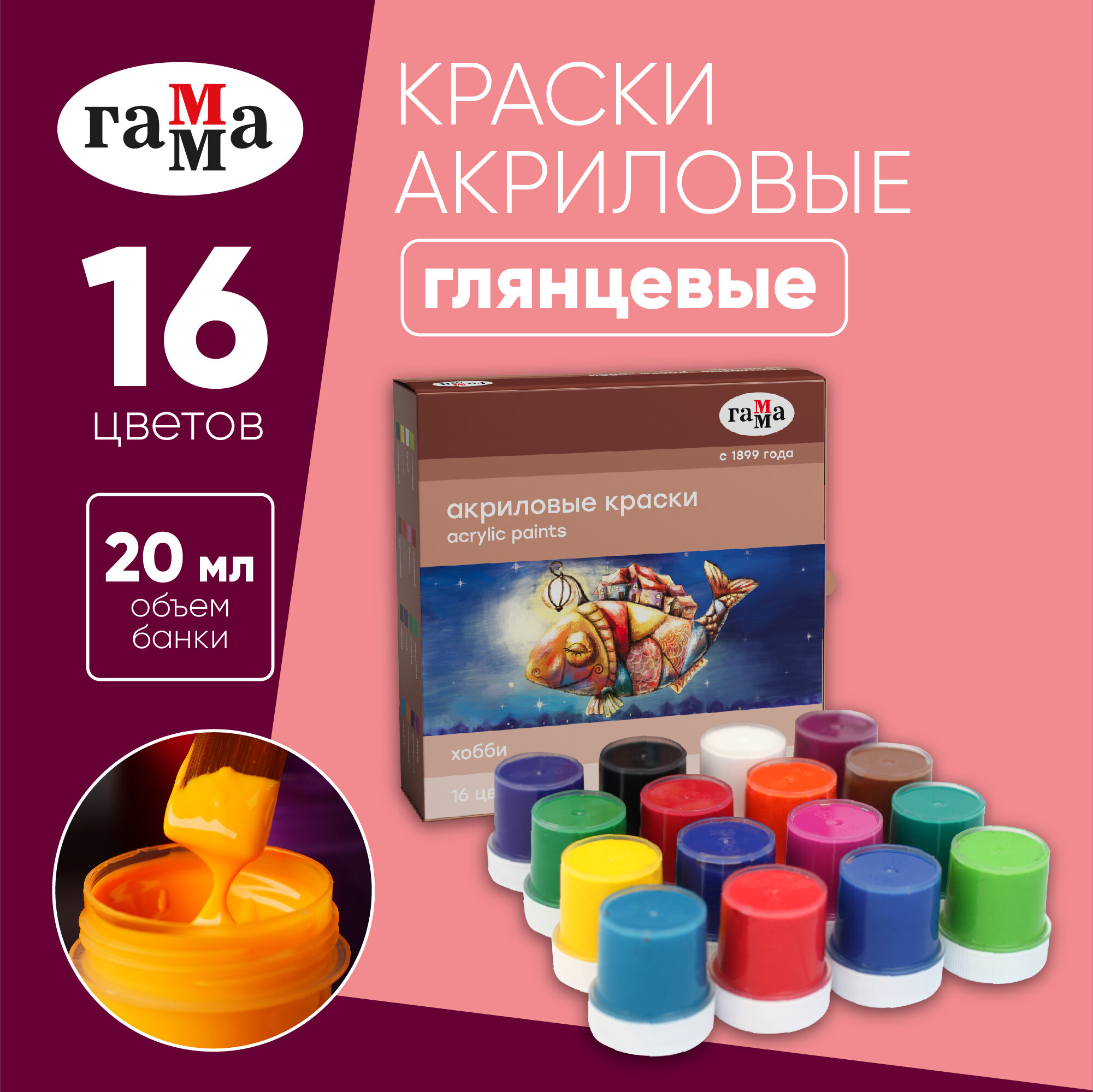 Купить Краски акриловые Гамма "Хобби" профессиональные декоративные для рисования , 16 цветов в баночках по 20 мл / Набор акрила для живописи и творчества для художников